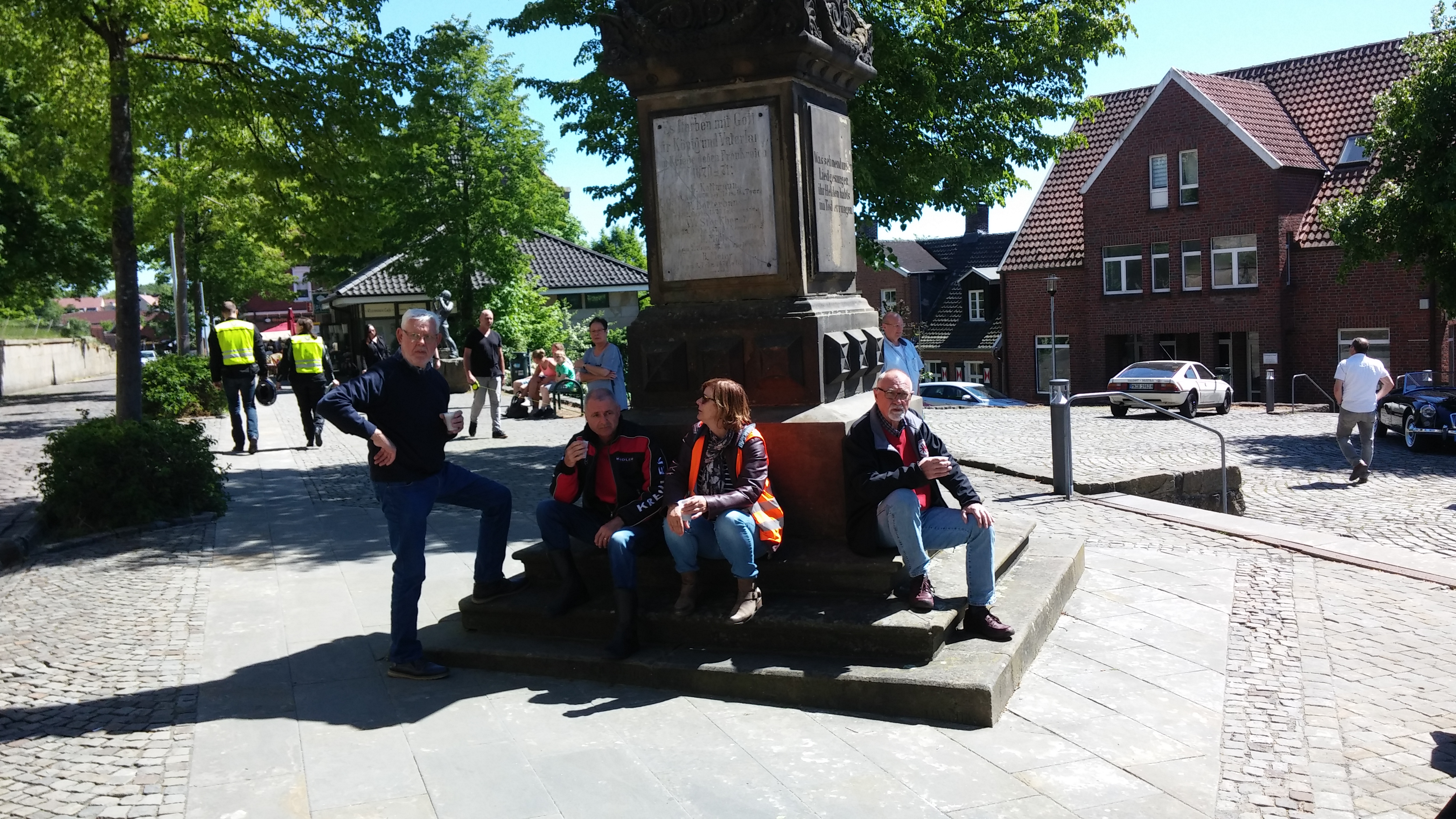 Markerink (en hun familie) met koek en zopie. Op dit plein is elke eerste zondag van de maand een oldtimermeeting. (Hoofdzakelijk auto’s).