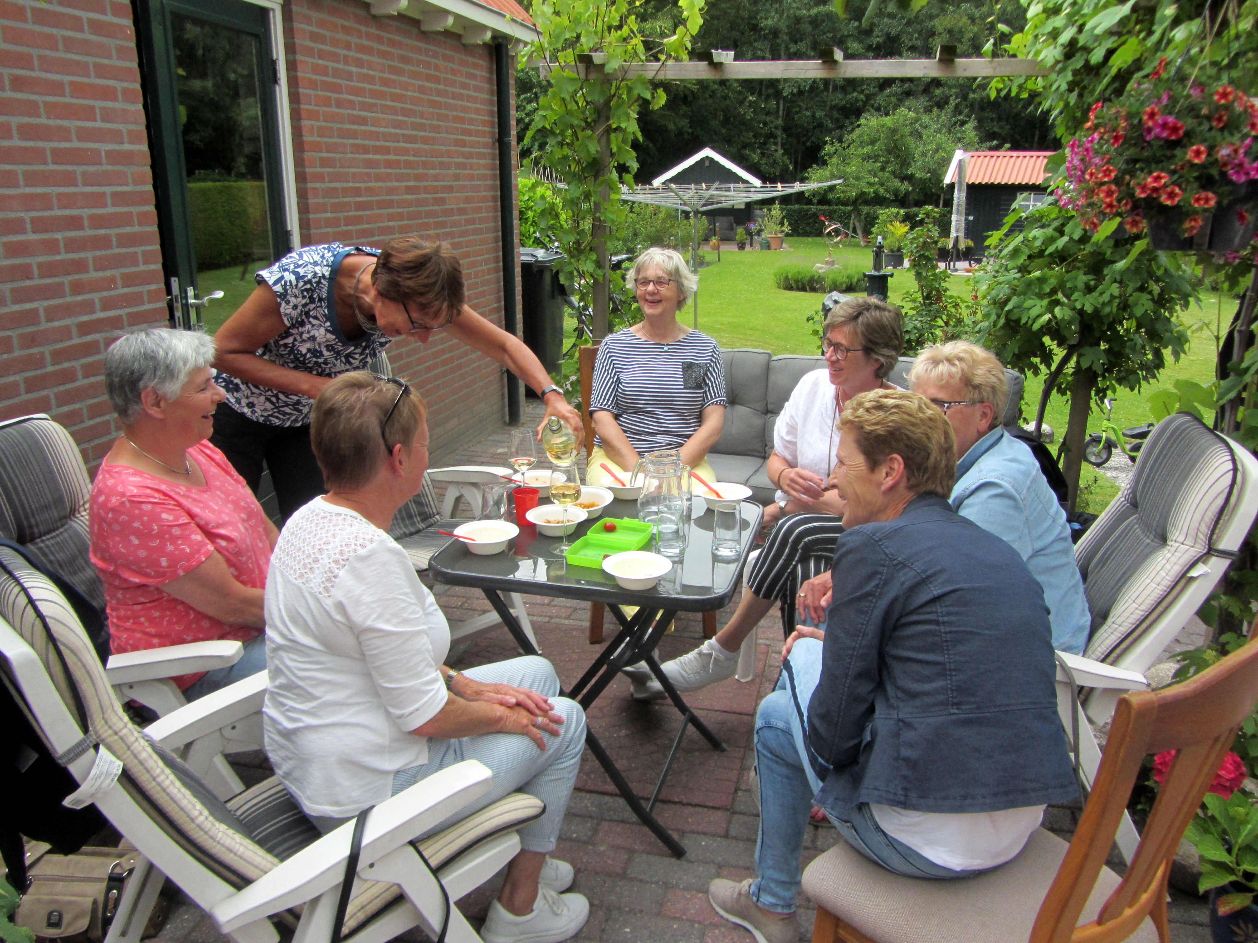 In de achtertuin kregen de deelnemers/sters in een stralend zonnetje koffie met