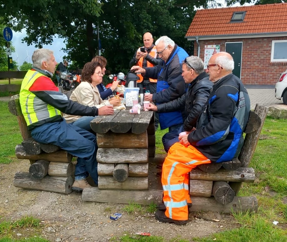 Boven aan gekomen bij de molen stonden de dames van Henk en Harry klaar met koffie en koek.