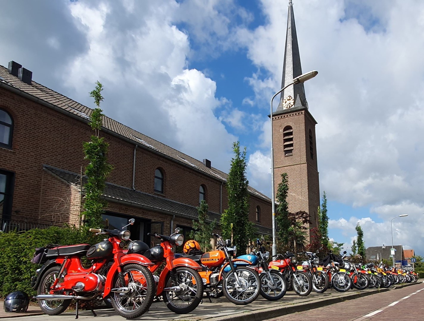 Uiteindelijk stonden er 44 brommers (43 heren en 1 dames) mooi in het gelid. Oud inwoner van Vragender Willie Spexschoor kwam uit Beltrum met een Benelli T50 aangereden en trok natuurlijk de aandacht. Het weer was prima en de koffie smaakte goed. Na een woord van welkom door Wilfried, werd er in 3 groepen gereden met een voorrijder en met een ,,Tom-Tom ,, op het stuur, (Werner, Wilfried en Cyril). Rond de klok van 11.00uur ging het licht op groen. Na een rondje door het dorp ging het langs de ruïne uit 1444 (Voormalige St. Jacobskapel ) en vervolgens richting Corle, rondom Winterswijk, Ratum, Kotten naar de uitbater ,,Italiaanse meren,,. Na een uurtje was menigeen toe aan tomaten soep, broodje kroket en koffie.