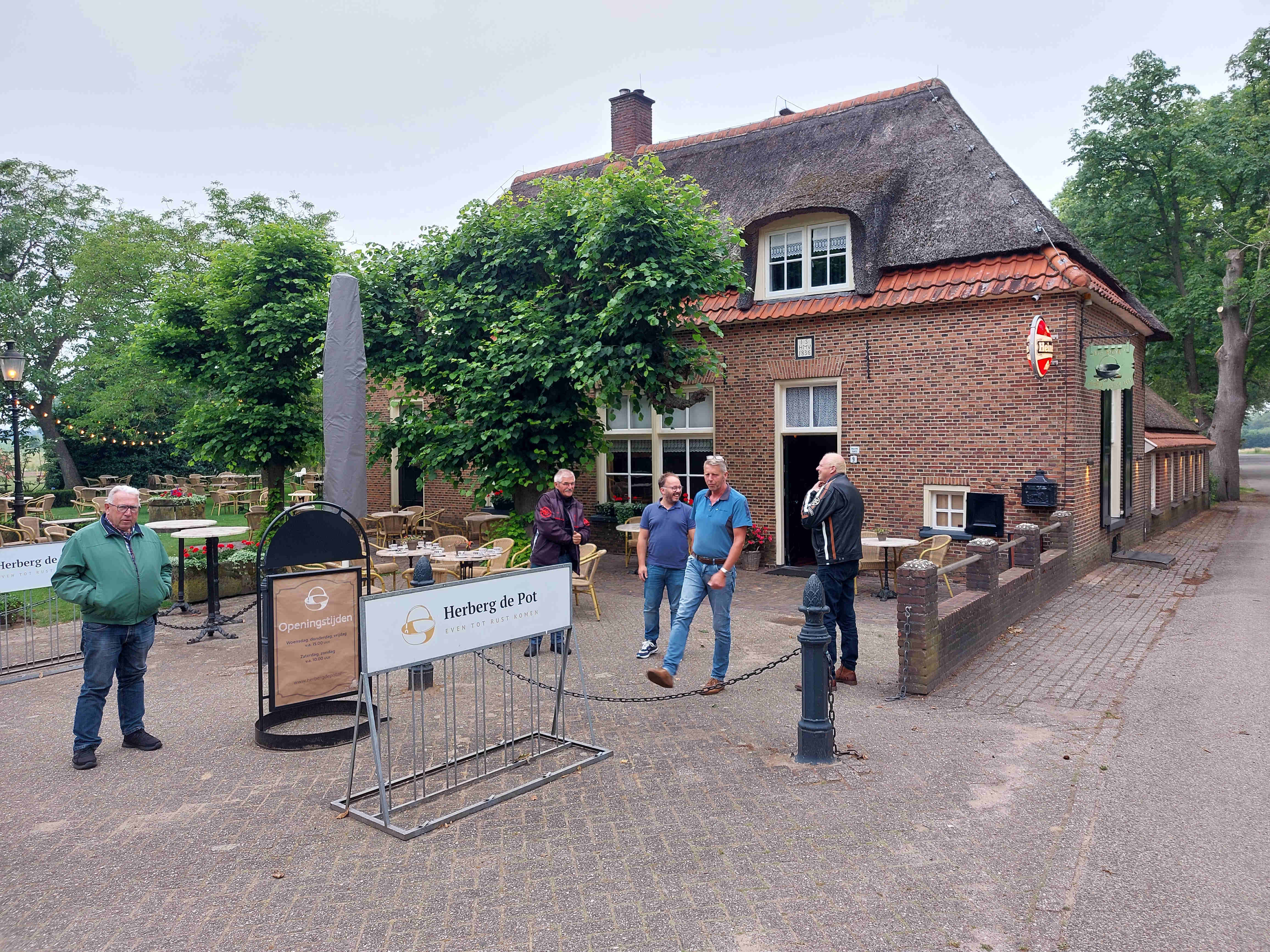 Dat was, toen we daar buiten zaten de kippen over onze tafels vlogen. Echter toen ik in de omgeving aankwam waarvan ik dacht hier moet het zijn, geen Potdijk te bekennen. Ik vragen aan een man die daar net de hond uitliet. Hij zegt je moet aan de andere kant van de rotonde zijn en dan rijden tot vlak voor Markelo en dan links af, dat is de Potdijk en daar is ook Herberg de Pot.