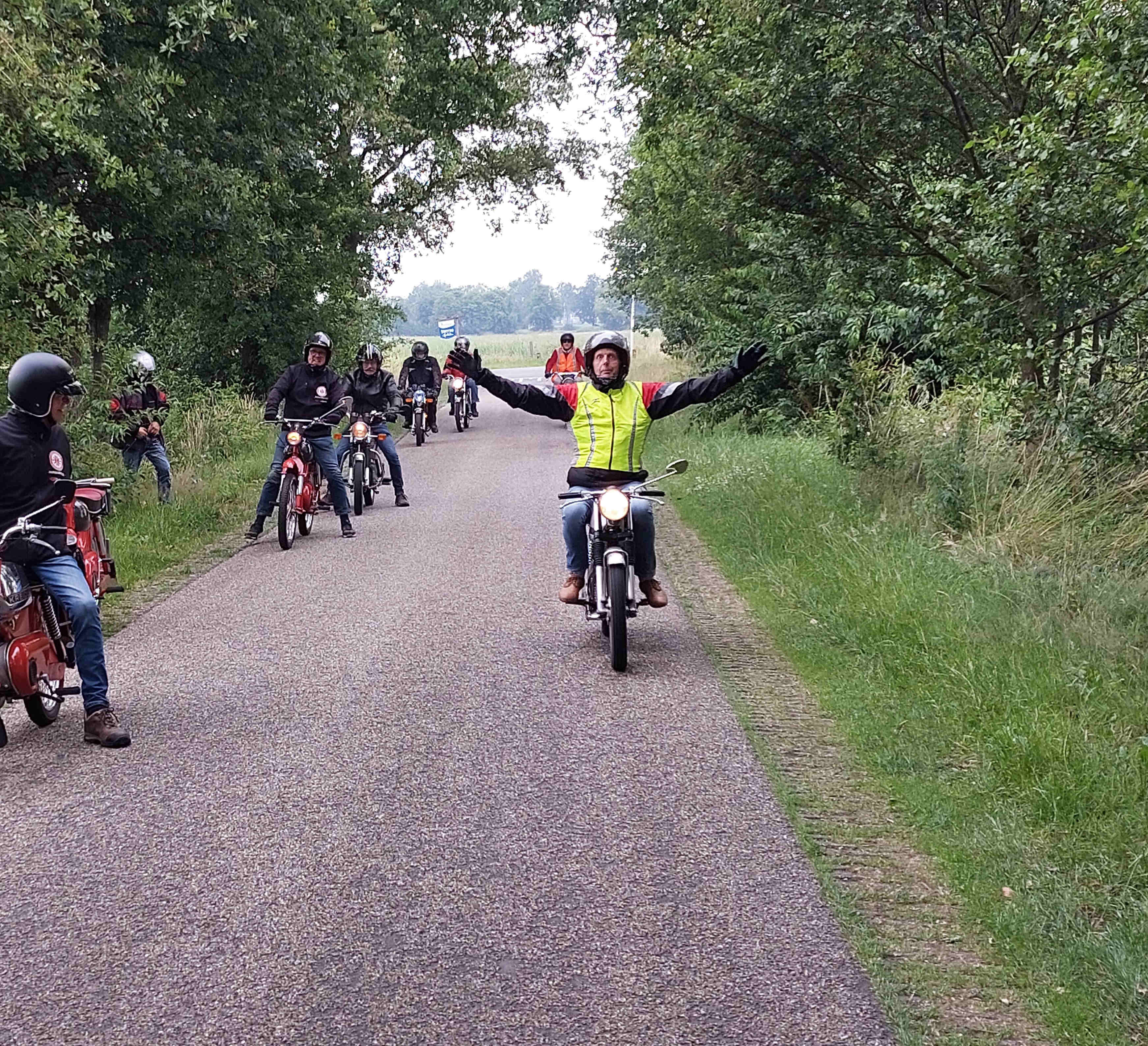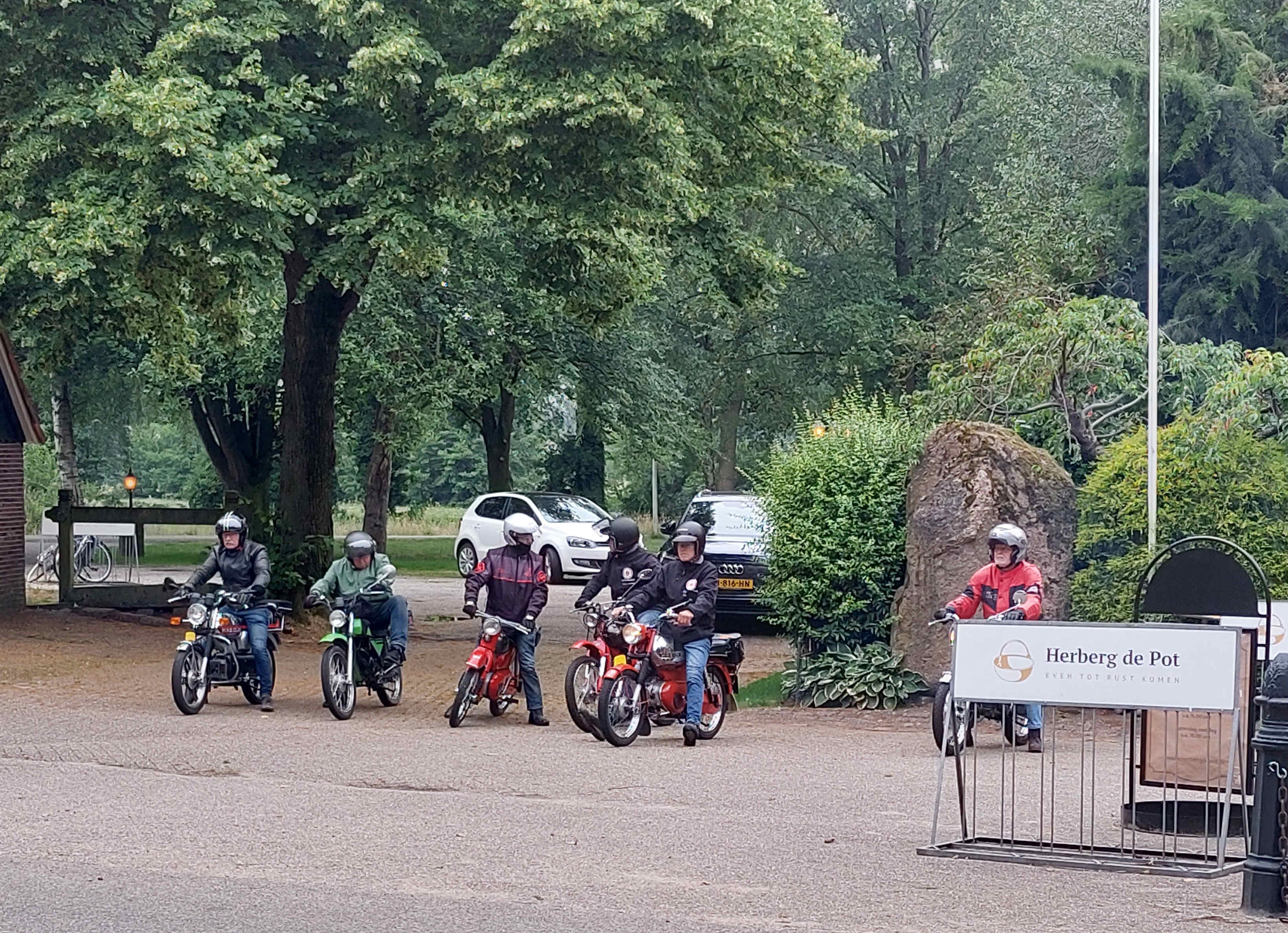 De rit verliep goed op een paar kleine probleempjes na. Van èèn weet ik het probleem niet en het andere probleem had ik zelf. Na het bezoek aan de ijstent was ik vergeten de benzinekraan weer open te zetten. De brommer hield er dus mee op. Ik kreeg hem echter niet weer aan de praat. Net toen ik dacht ik zal de bougie er maar eens uitdraaien kwam hij weer tot leven. Wat het weer betreft was het droog, persoonlijk vond ik het nogal fris. Tegen 21.00 uur waren we weer terug bij Herberg de Pot.