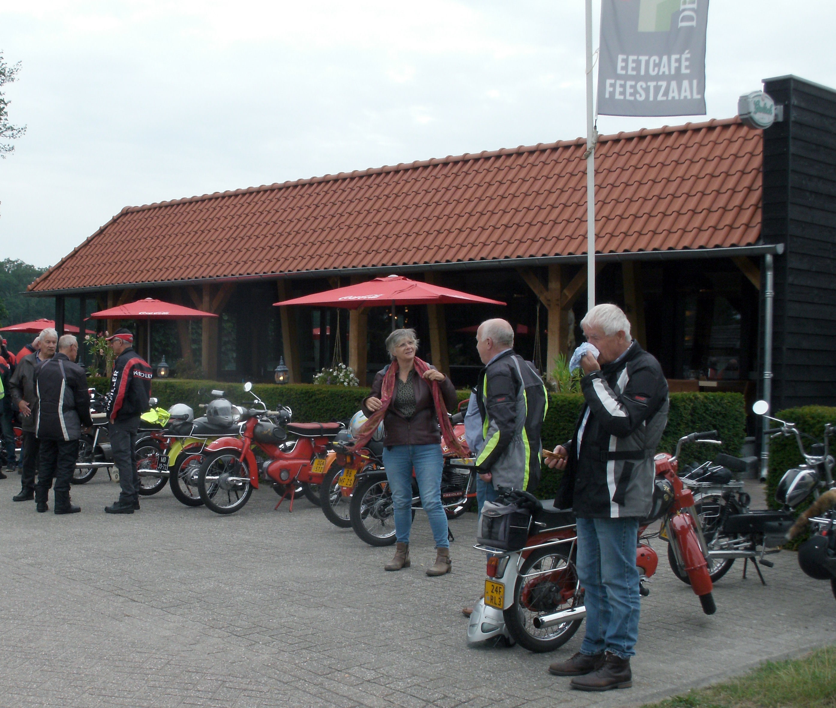 Toch was dat voor mijn vrouw geen reden om niet mee te gaan. Wij zijn dan ook met ons drieën, mijn kameraad Han was er ook bij, vanuit Haaksbergen vertrokken. Onze heenreis was niet echt toeristisch, maar via Neede, Borculo en Ruurlo wel de snelste manier om in Veldhoek te komen. Toen wij om 09:50 bij het restaurant "De Veldhoek" tussen Ruurlo en Zelhem aankwamen, waren er al zo'n 15 bromfietsfanaten aanwezig.