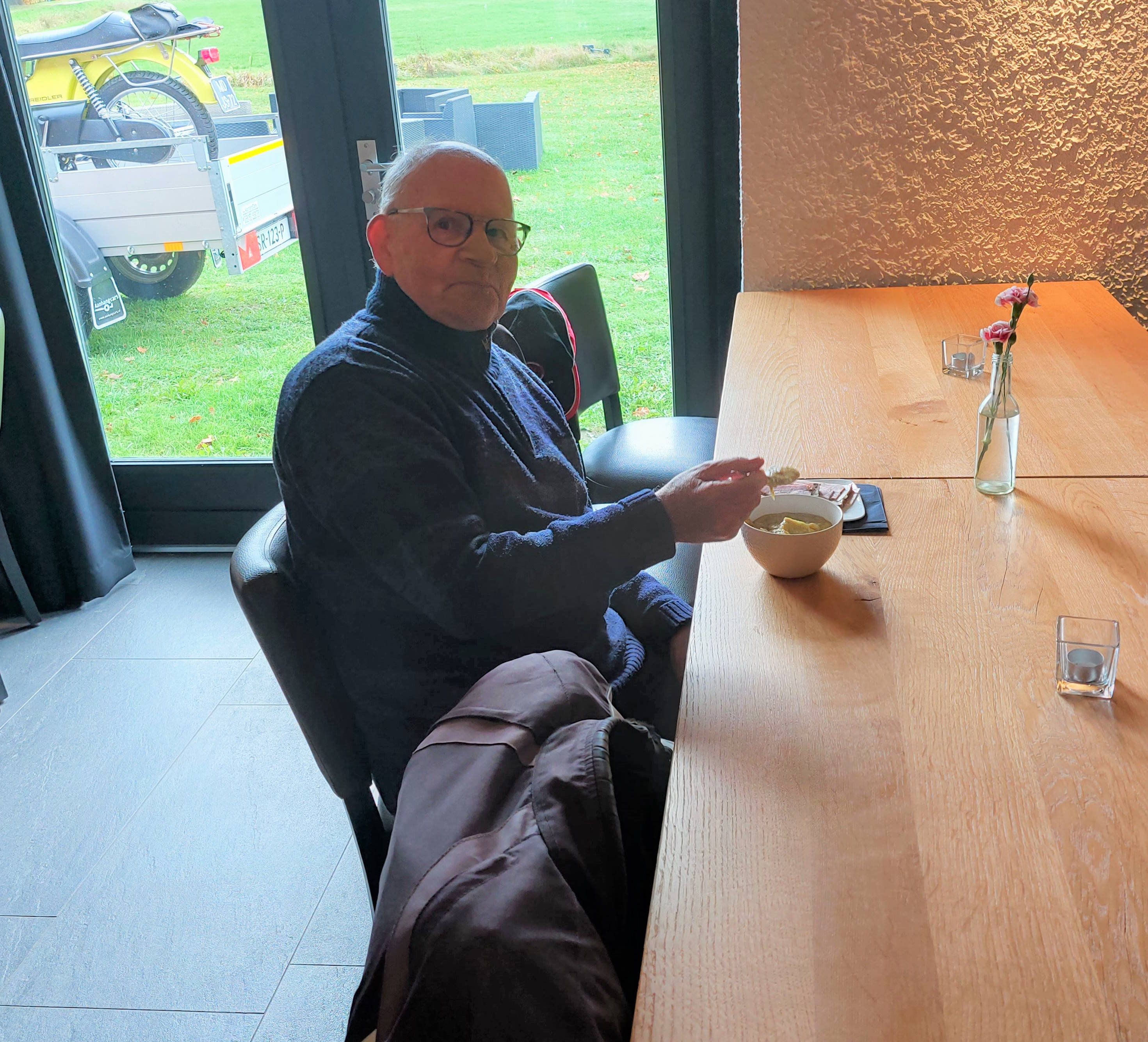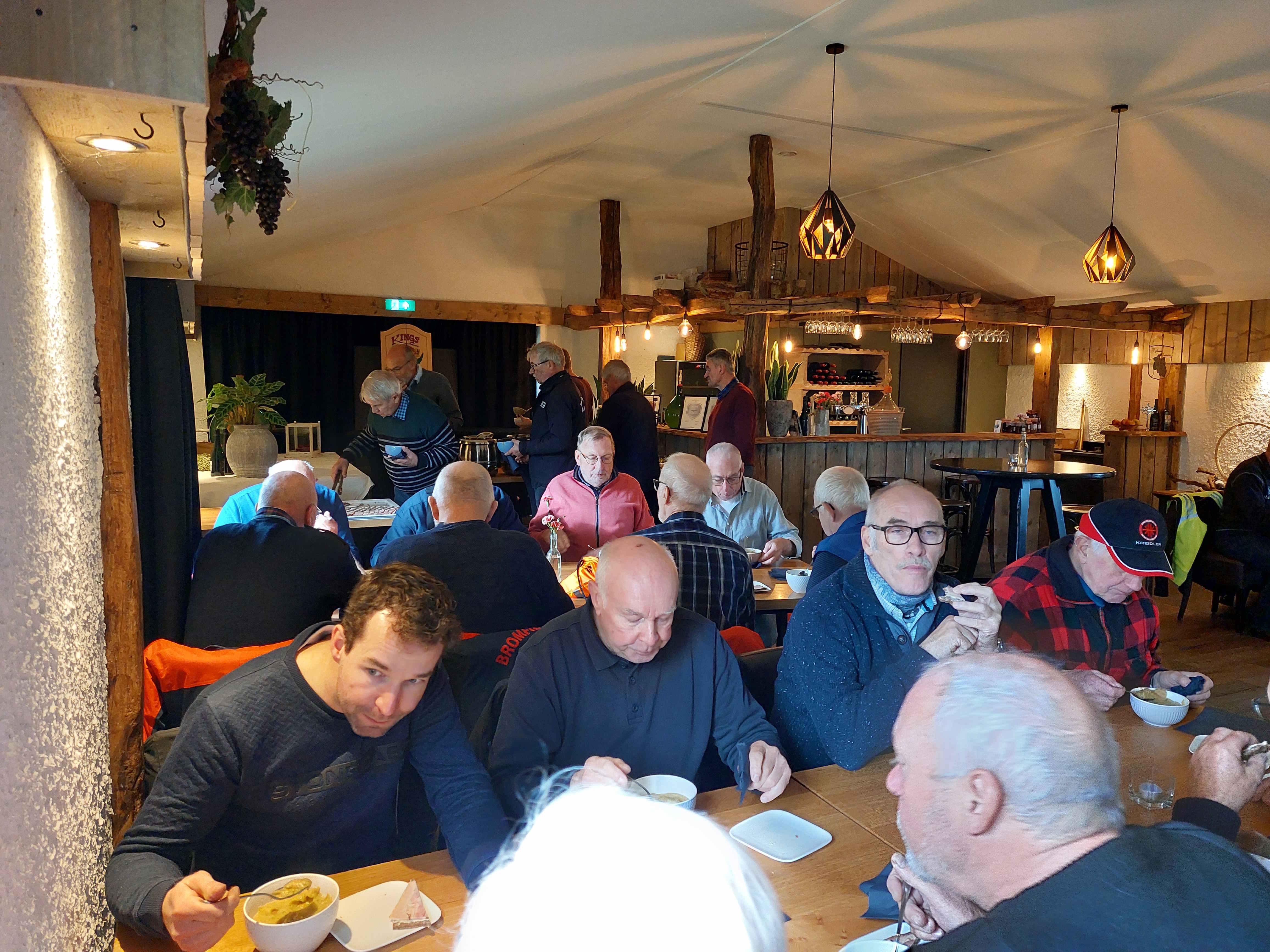 Toen naar binnen waar de pan met snert en roggebrood met spek klaar stonden. We lieten het ons goed smaken.