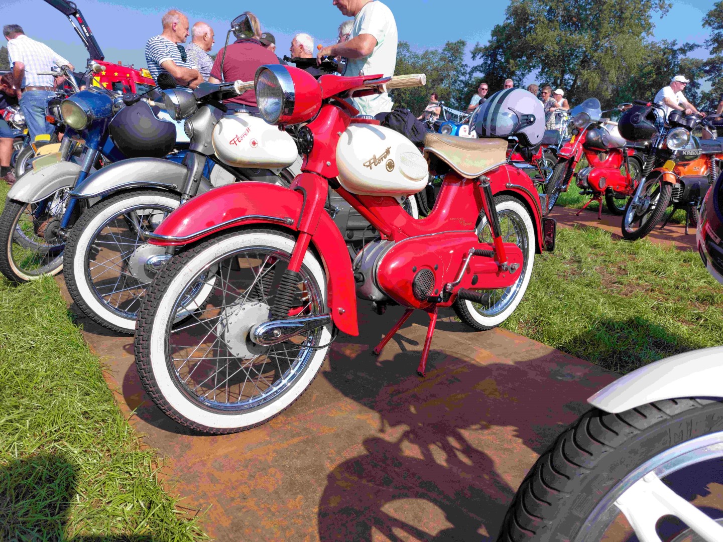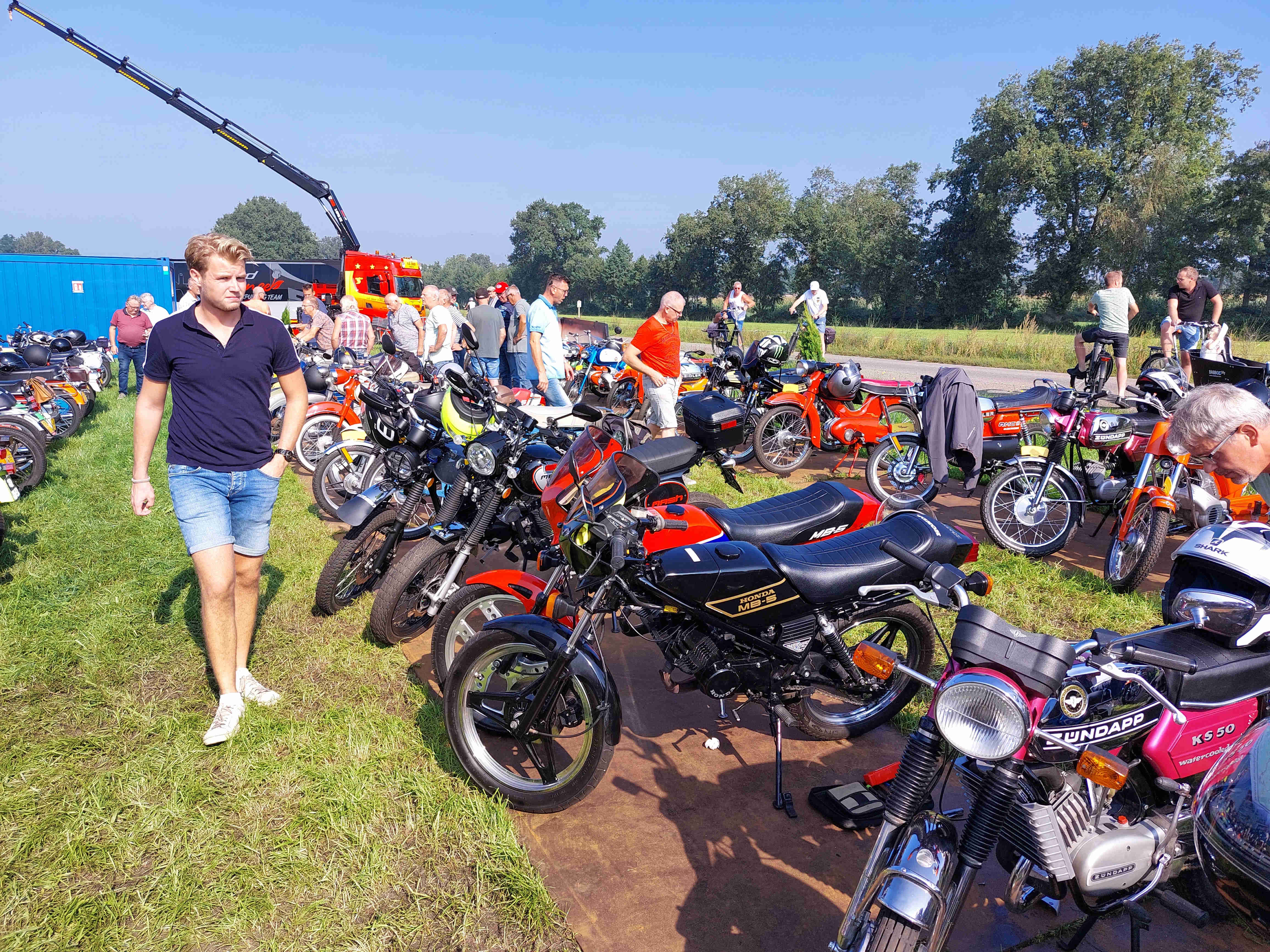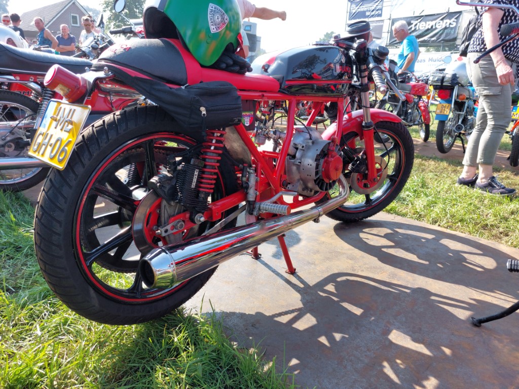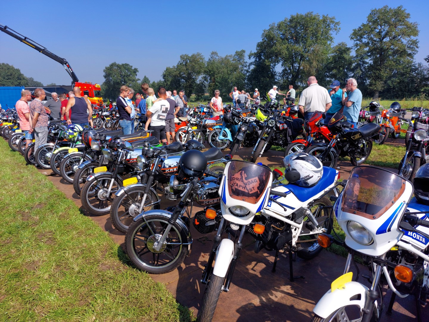 Inmiddels stonden er op het terrein al een behoorlijk aantal brommers/motoren. Uiteindelijk waren het er ongeveer 265. (Heb ik gehoord) Ze stonden gestald op stalen rijplaten. Er waren enkele bijzondere exemplaren bij waaronder een eigenbouw Malanca met een wankelmotor. Om ongeveer 12.00 uur werd het startsein voor de rit gegeven.