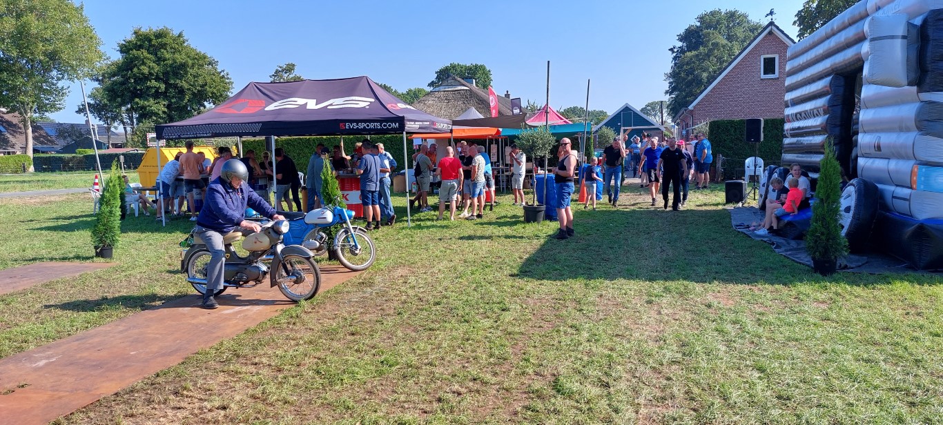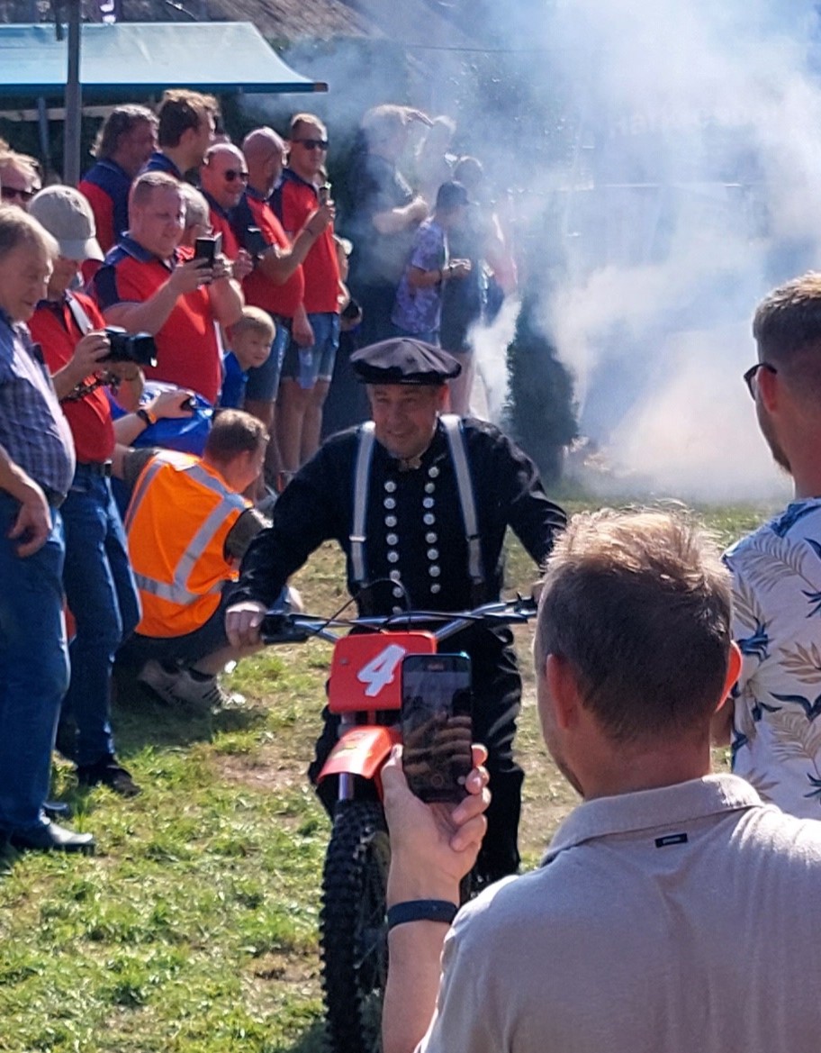 Dit ging op een bijzondere manier. Jan Harke kwam aanrijden op zijn Kreidler en reed door een spandoek waarop een