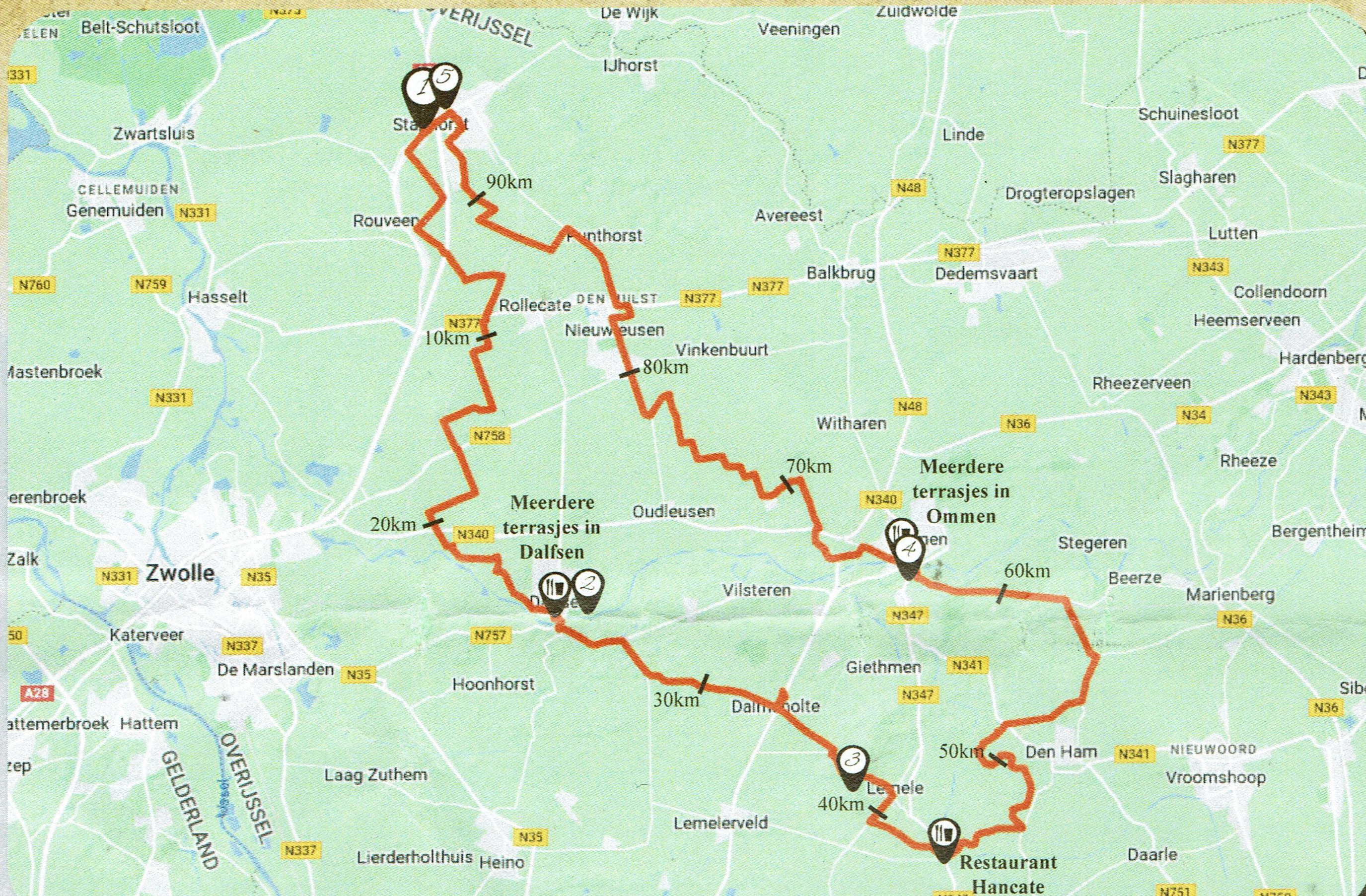 Start dus vanaf het terrein bij Jan Harke, Rouveen, Dalfsen (Prachtig kasteel ,,Rechteren,,) , Dalmsholte, over de Lemelerberg naar Lemele, Hancate, langs Den Ham, dan richting Ommen. In Ommen heb ik pauze gehouden op een terras met aan de ene kant de Vecht en aan de andere kant was er een concert van het Shantykoor ,,De Stuwzangers,, uit Vilsteren.