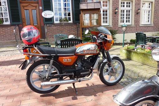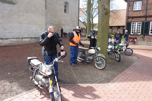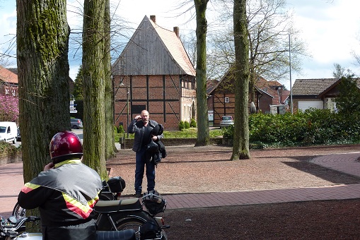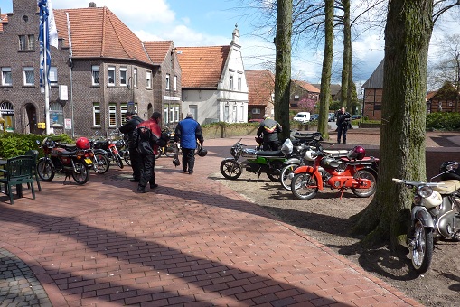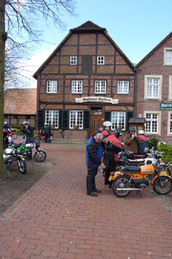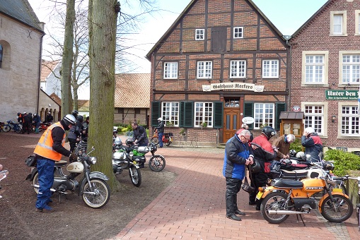 We kregen langzamerhand honger dus zijn we na zo'n 20 minuten weer verder gereden. Toen kregen we een mooie route over de kleine en steile weggetjes op de Schöppinger berg. Wederom waren de rookpluimen goed zichtbaar en iedereen kon even testen of de Kreidler helemaal klaar is voor het weekend naar de Eifel dat half mei gepland staat of de rit naar het Teutoburger wald dat eind augustus op de agenda staat. We zijn via Schöppingen naar het oude plaatsje Asbeck gereden waar ik een restaurant besproken had om wat te eten.