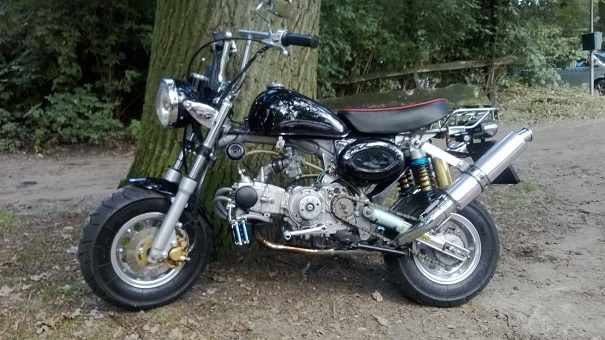 Thijs, onze gastrijder uit Hengelo Gelderland, bereed een bijzondere motorfiets; een Skyteam. Dit is een cloon van een Honda Monkey. Een bijzonder kleine motorfiets met een olie gekoelde Honda motor (niet origineel) van 105 cc, 12 PK en een top van zo’n 115 km/h. Met zijn velgen van 8 “ is het meer een fun-bike dan een echte motorfiets. Hij heeft meerdere Honda’s in huis en kan er boeiend over vertellen.