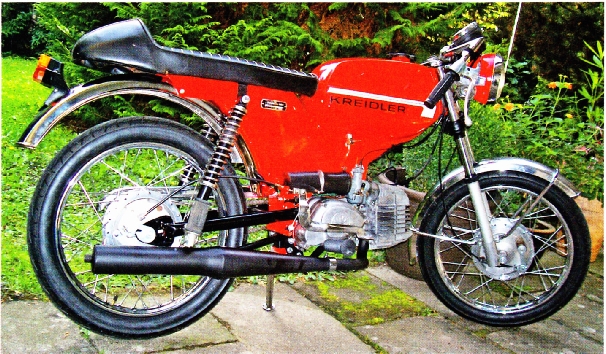 Ralf Kromer: Altijd al heeft hij een passie voor sleutelen gehad. Op zoek naar een bromfiets kocht hij voor 950 DM een gebruikte Kreidler Florett RS, model 1973. De vorige eigenaar had er een hoog stuur en buddyseat met een achterspoiler op gemonteerd. Iedereen reed destijds zo rond, herinnert hij zich. Hij wilde daarom iets origineels, een voertuig dat ten minste visueel zijn handtekening kon dragen. Zogenaamde softchoppers waren destijds volop in de mode. Ralf Kromer had die in zijn jeugd ook meegemaakt. De druppelvormige brandstoftanks van een Kreidler Flory bromfiets werden op het Florett plaatframe gebouwd. Net zo avontuurlijk als een sterk afgeknotte buddyseat naar voorbeeld van de Easy Rider Harleys van Peter Fonda en Dennis Hopper. Omdat een echte chopper nou eenmaal een stijf frame heeft, werden de twee verende voorpoten vervangen door twee voldoende lange stukken vierkant staal. Ook het achterspatbord vond de bouwer overbodig, hetzelfde gold voor de kettingkast. De vooruit stekende voetsteunen die boven de horizontale cilinder gelegen waren gemaakt uit hoekijzer.