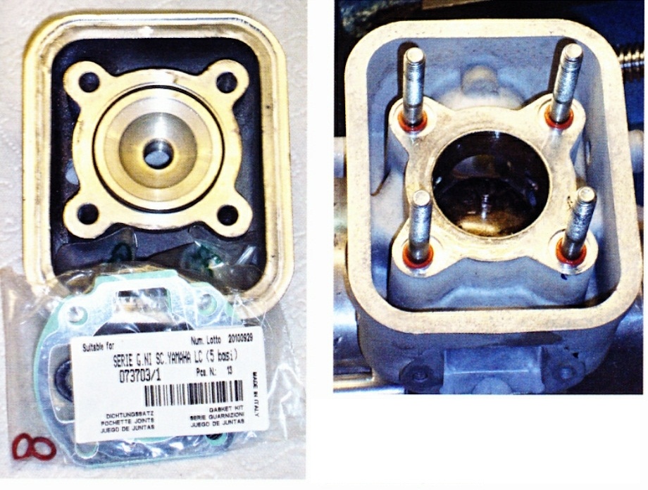 Links de cilinderkop met eronder in het plastic de pakking set. Rechts de cilinder zelf