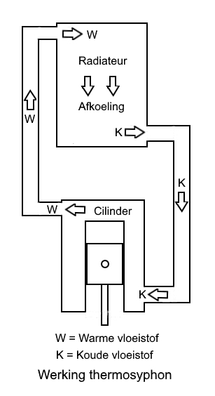 (thermosifon principe betekend dat warme vloeistof lichter is dan koude en dus de warme vloeistof op stijgt en aldus een natuurlijke circulatie in het koel circuit ontstaat).Zie de figuur werking van thermosifon. Als dit niet mocht werken kon hij altijd nog een pomp toepassen.Nu moest hij aan slangen zien te komen om de cilinder met de koeler te verbinden.
