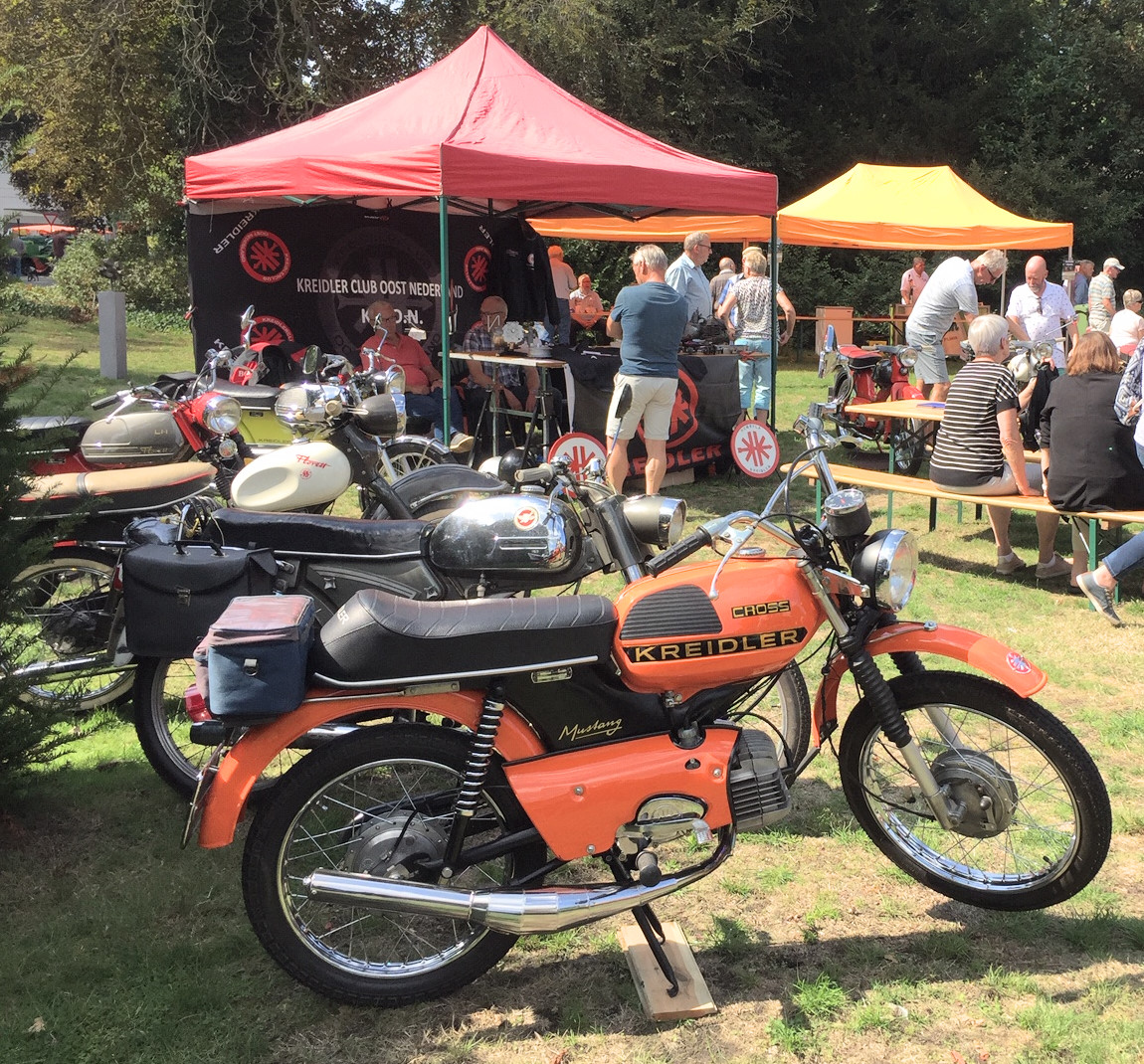 (Ruurlose zomerdagen voor de niet Achterhoekers). Ons KCON lid Peter Schoenmakers nam de organisatie van de bromfietsen op zich. In de evenementenagenda stond de aankondiging, waarbij Peter verzocht om Kreidlers, die de stand luister bij zouden zetten. Die dag reed ik vanuit Huissen naar Ruurlo op mijn 63-er eitank Mokick. Het was perfect weer. In Ruurlo stonden een paar straten vol met kraampjes, oude tractoren, enz.