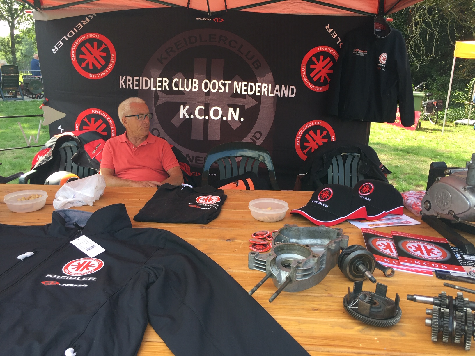 De achterwand bestond uit onze vlag. Op de tafel waren Kreidler spullen uitgestald,