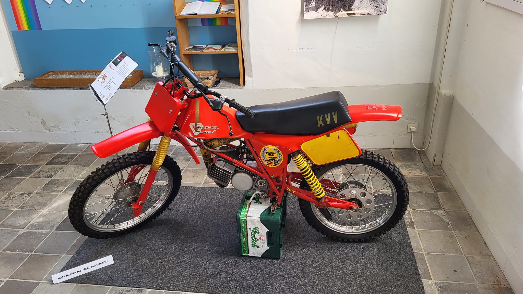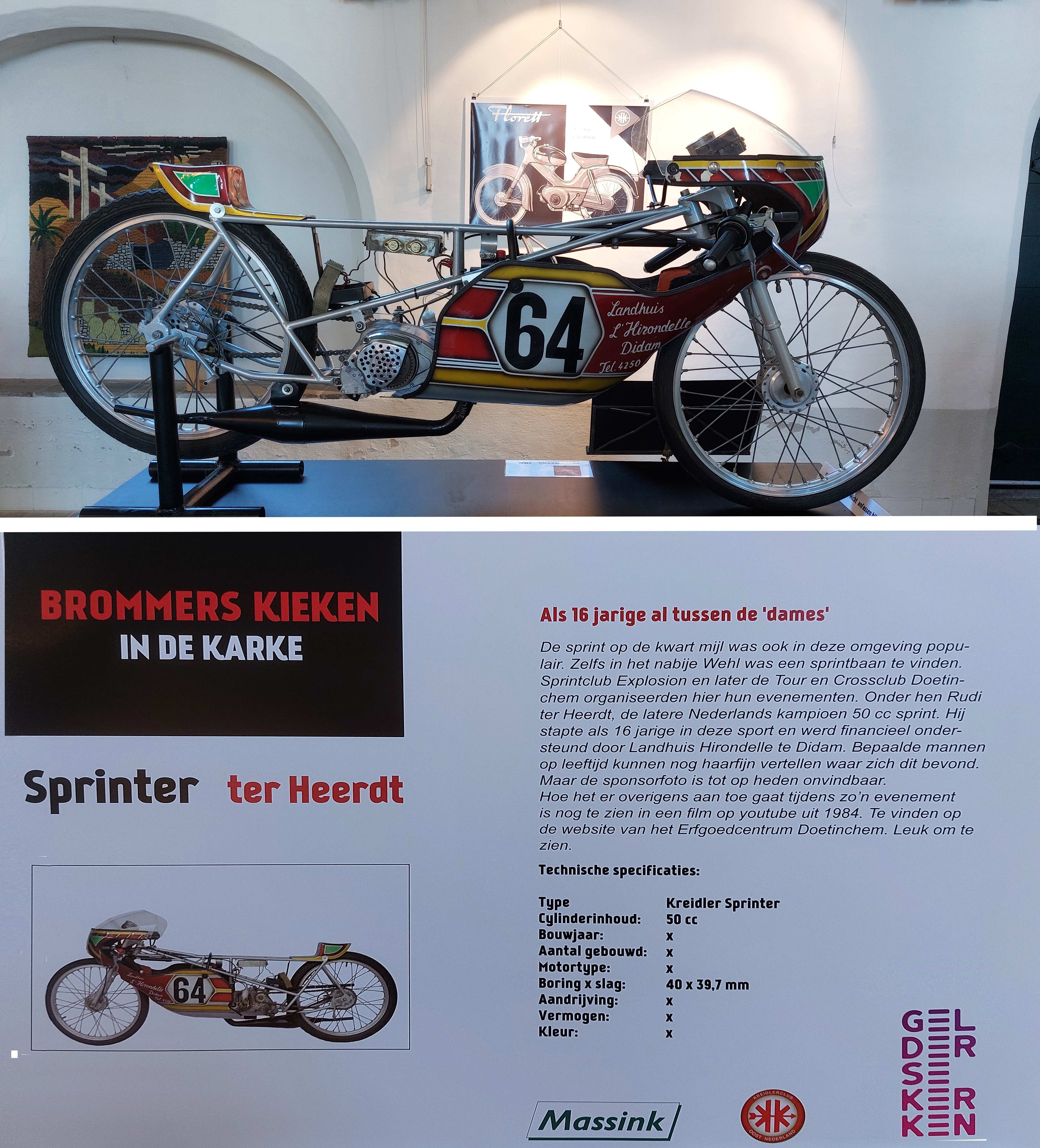 Toen ik bij de Karke aankwam en binnen keek vielen mij de schellen van de ogen. Ge-wel-dig !! Prachtig dit had ik niet verwacht. !! Op het koor (voorste gedeelte in een kerk) stonden diverse modellen van Kreidler en in de gangpaden al dan niet op een verhoging diverse specials. Ook de promostand van onze club stond in een gang pad opgesteld. Langs de wanden was een ophangsysteem aanwezig waar aan diverse afbeeldingen met Kreidler onderwerpen waren opgehangen.