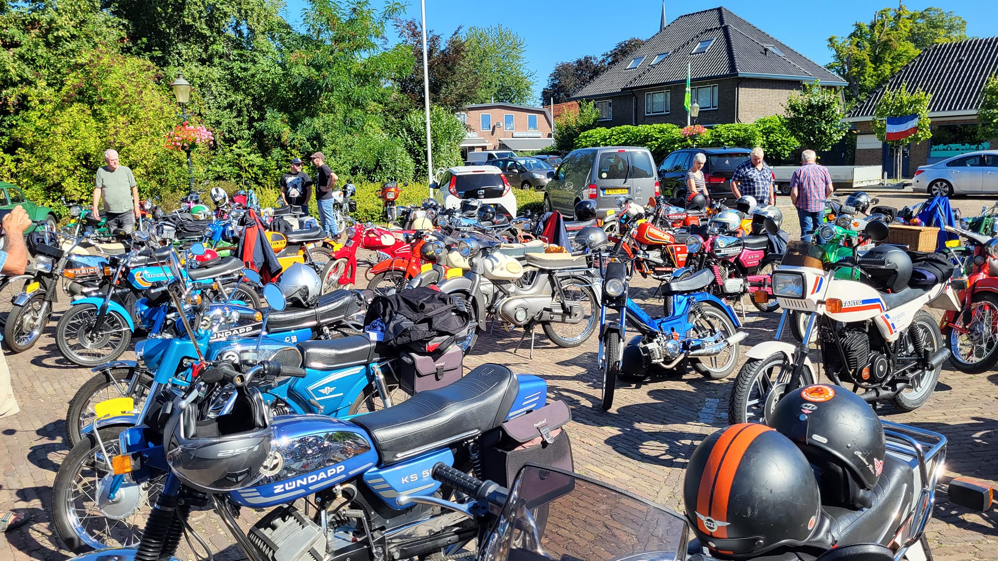 Pauze in Toldijk bij de firma Massink en weer terug naar de Remigiuskerk in Steenderen. Het was een mooie afwisselende rit door de prachtige omgeving. Ook ging de rit deels over zandfietspaden en zandwegen. Op deze paden en wegen was het oppassen geblazen dat door het mulle zand het stuur dwars kon slaan en je onderuit ging. Een nadeel van zandwegen is ook dat je brommer onder het stof komt te zitten maar daarover later meer. Bij Massink in Toldijk was de pauze. Massink is een handelaar/importeur in oldtimer bromfietsen (voornamelijk Zündapp) gewone bromfietsen, scooters, helmen, onderdelen en motorkleding.