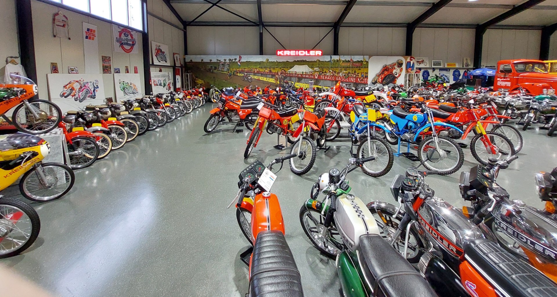 Toen kwamen we aan bij ons eigen merk: Kreidler. Louwrens heeft er een mooi aantal staan, keurig opgesteld in carrévorm. De meeste modellen stonden er en ook machines als