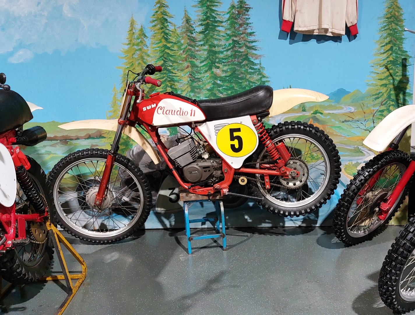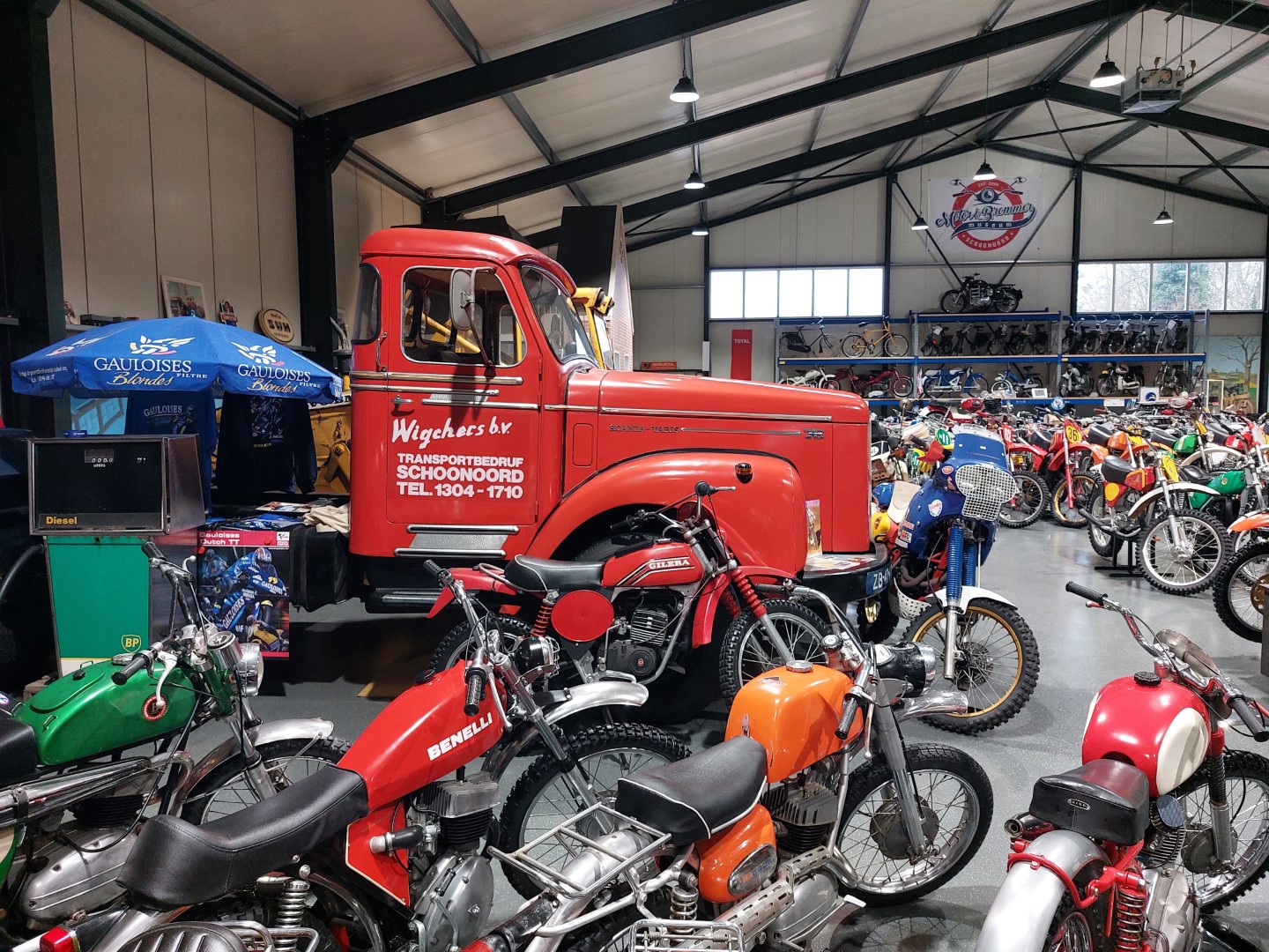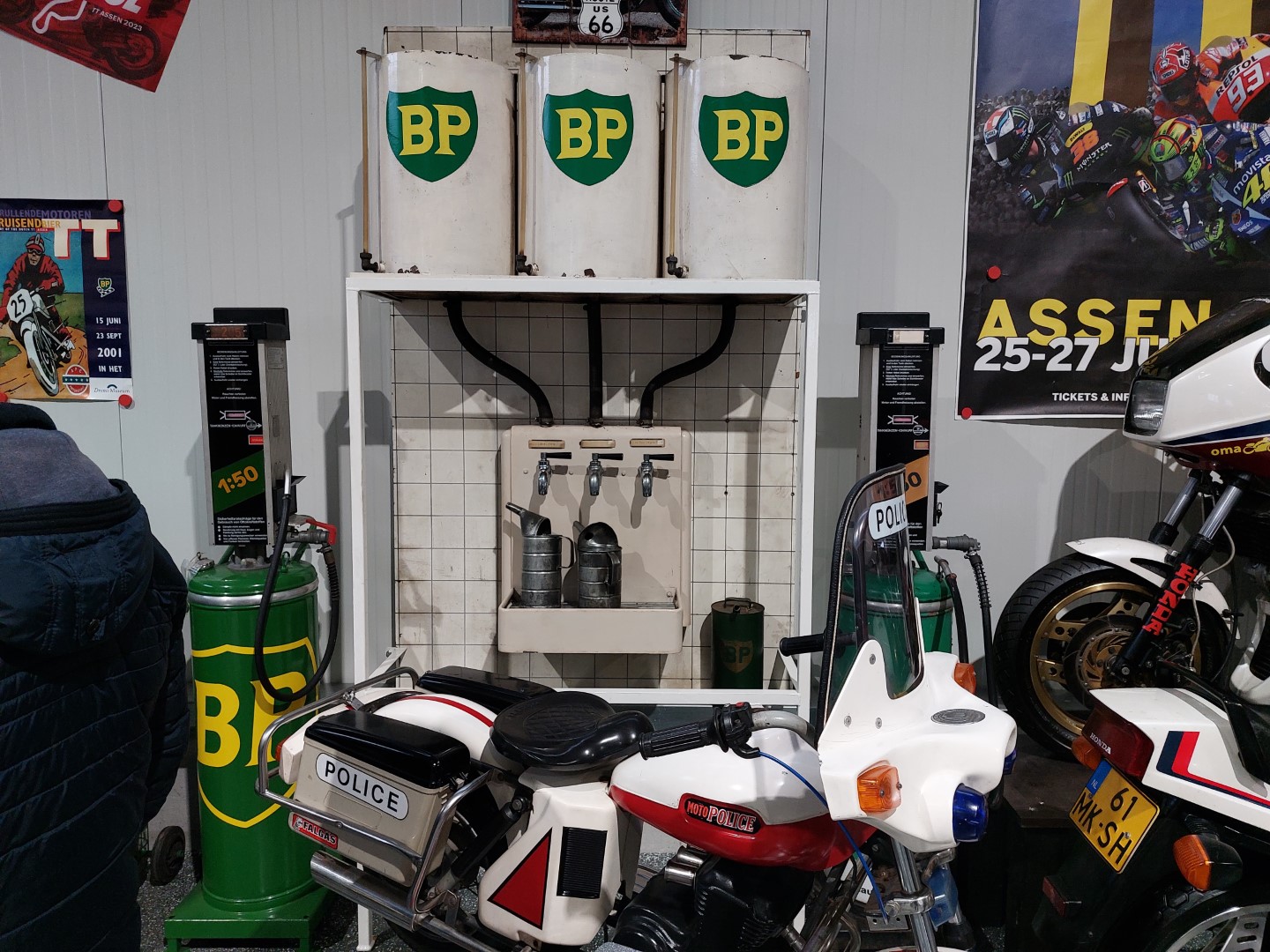 Ook stonden er zijspanmachines bij. Verder is het museum aangekleed met allerlei aanverwante zaken zoals legio foto’s van motoren brommers al dan niet met foto’s van renners en crossers er bij op. Wat er ook staan zijn de beroemde tweetakt benzine pompen met een tank en een maatglas er boven op. Veelal zijn die van het merk Bereila (BErghuis, REIneking en LAanstra.)