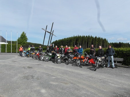 We zijn met ons drieën (mijn Kreidlervriend Nico Neuteboom en mijn zoon Martijn Slingerland) vertrokken met prachtig weer op vrijdag 23 mei om 8:30 uur richting Dasburg. We kwamen daar aan om 13:00 uur in de regen. We werden uiterst hartelijk ontvangen door Jan en Hilly Koelewijn van motorhotel Daytona en door allemaal goed gehumeurde Kreidler vrienden en vriendinnen. De omgeving was ook hier prachtig en het etablissement zag er heel gezellig uit. Al snel stopte het met regenen en werd het mooi en droog weer! Na dat we de boel hadden afgeladen en de tassen op de mooie rood/gele kamer hadden gezet was het even tijd voor een drankje op het terras. Om 15:00 uur gingen we eindelijk rijden onder leiding van Wim Top, die daar een paar weken eerder even de omgeving had verkend en een mooie route had uitgezet. Hij heeft met Jan de Groot en Ben Eenink 1100 km gereden met de auto om dit te realiseren. Wij zijn die middag met 15 man en 1 vrouw richting Clerveaux gereden en een beetje rond het hotel. Na 40 km te hebben gereden waren we om 16:15 terug. Tijd voor een versnapering, maar Nico ik en mijn zoon hadden zin in meer kilometers, dus we zijn voor het diner nog een stukje rond gegaan. Om 18:30 hebben we van het diner genoten en meteen erna liepen Thomas en Gerhard Beumer naar buiten. Ik dacht eerst dat ze gingen roken ofzo, maar echt niet. Meteen de helm weer op en we zijn er direct achteraan gegaan. Harry Rouhof was er ook bij en hij was al sinds 11:00 uur daar en was niet van zijn blauwe Kreidler af te krijgen. De route ging over de door Harry eerder die middag ontdekte geitenpaden, en dat hebben we geweten ook. Af en toe in de eerste versnelling en een beetje bagger op de wegen. Prachtig!!