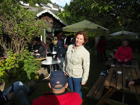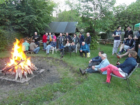 Om 16:30 uur waren we terug in Dasburg en zonder technische problemen trouwens. Even wat drinken binnen en/of buiten en natuurlijk ondertussen vele technische zaken besproken en opgelost. Om 18:30 uur werd de BBQ aangestoken. Perfect in de tuin tegenover het hotel. Alles er op en er aan incl. kampvuur. Helaas geen rituele bromfiets verbranding gehouden aangezien er geen vreemde merken (Zundapp) bij waren. Even na half 8 sprong Thomas, nog bijna kauwend op de karbonade, op. Wie gaat er nog even mee een stukkie rijden? Hilly snapte hier niets van en vroeg: Hebben jullie al genoeg gegeten dan? Iedere gek heeft zijn gebrek werd ons nog nageroepen.