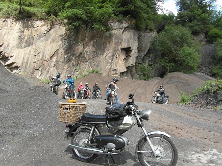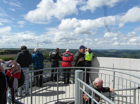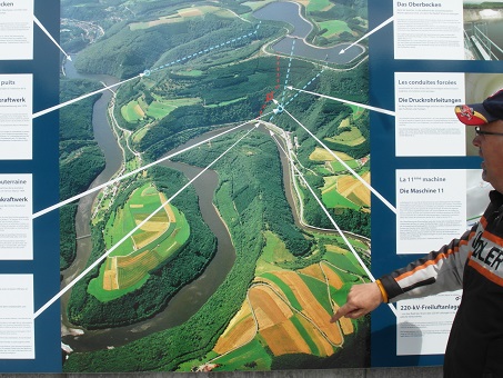 Om 10:00 uur vertrokken over schitterende wegen die soms voor de Kreidler Flory van Trees Brinkerink iets te steil waren. Trees en haar Flory deden het trouwens allebei prima, maar als de Flory het er soms bijna te veel van kreeg hielp Thomas Beumer deze soms door de voet achter op de bagagedrager te zetten en iets meer gas te geven met zijn Super waardoor Trees dus een klein duwtje in de rug kreeg. Maar je het is de Eifel en dus hoe steiler de wegen hoe beter ik het vind! Ik reed direct achter de voorrijder Wim Top en Nico achteraan. Allebei dit jaar voor het eerst met een intercom, en dat ging prima. Regelmatig moest ik even tegen Wim zeggen om even iets rustiger aan te doen waardoor de groep weer bij elkaar kon komen. Niet dat Wim te hard reed hoor, keurig 40 km per uur maar er wil wel eens iemand achter blijven bij de beklimmingen van de steile wegen. De voorzitter Jan de Groot reed vast achter aan en kon alles goed in de gaten houden. De route die dag werd uiteindelijk 120 km was ging via Vianden, Fouhren naar Echternach (Luxemburg). Via de Duitse kant van de grens ging het terug. De grens is hier de rivier de Our/Sure. We gingen via Bollendorf, Wallendorf, Gentingen, Vianden, Eisenbach terug naar Dasburg. Op de heereis hebben we de waterkrachtcentrale bij Vianden bezocht met de hele groep.