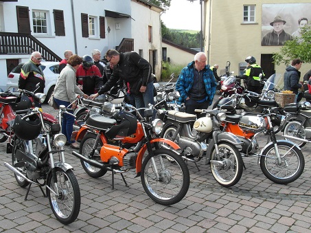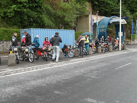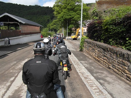 Om 10:00 uur vertrokken over schitterende wegen die soms voor de Kreidler Flory van Trees Brinkerink iets te steil waren. Trees en haar Flory deden het trouwens allebei prima, maar als de Flory het er soms bijna te veel van kreeg hielp Thomas Beumer deze soms door de voet achter op de bagagedrager te zetten en iets meer gas te geven met zijn Super waardoor Trees dus een klein duwtje in de rug kreeg. Maar je het is de Eifel en dus hoe steiler de wegen hoe beter ik het vind! Ik reed direct achter de voorrijder Wim Top en Nico achteraan. Allebei dit jaar voor het eerst met een intercom, en dat ging prima. Regelmatig moest ik even tegen Wim zeggen om even iets rustiger aan te doen waardoor de groep weer bij elkaar kon komen. Niet dat Wim te hard reed hoor, keurig 40 km per uur maar er wil wel eens iemand achter blijven bij de beklimmingen van de steile wegen. De voorzitter Jan de Groot reed vast achter aan en kon alles goed in de gaten houden. De route die dag werd uiteindelijk 120 km was ging via Vianden, Fouhren naar Echternach (Luxemburg). Via de Duitse kant van de grens ging het terug. De grens is hier de rivier de Our/Sure. We gingen via Bollendorf, Wallendorf, Gentingen, Vianden, Eisenbach terug naar Dasburg. Op de heereis hebben we de waterkrachtcentrale bij Vianden bezocht met de hele groep.