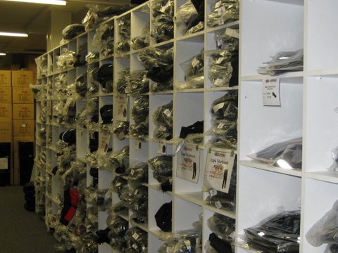 De rondleiding begon dan ook in de naaizaal, waar ook al enige voorbeelden voor shirtjes voor de KCON waren uitgestald. Vervolgens een showroom met laatste producten, diverse grote magazijnen met meterslange stellingen vol met broeken, jassen, schoenen, laarzen, brillen en ook een hal met stapels dozen gevuld met valhelmen (gelijk de skyline van New York).