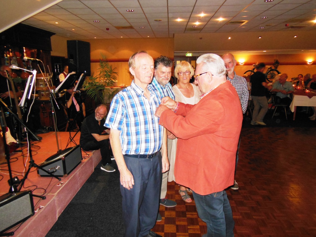 De muziek speelde nummers uit de 60 en 70er jaren,schitterend. Al hoorde ik zo hier en daar er zit geen Beatles of Rolling Stones bij. Persoonlijk had ik enkele Nederlandstalige nummers uit die tijd ook wel mooi gevonden. Dit blijf je houden, smaken verschillen nou eenmaal. Wat mijns inziens bij iedereen in de smaak viel was de demonstratie van de Rock and Roll groep. Het was een wervelende show. De avond werd op een uitstekende manier aan elkaar gepraat door ceremoniemeester Ben Dorenbusch. Hij had ook de taak om de aanwezige bestuursleden van het eerste uur en die nog lid zijn van onze club in het zonnetje te zetten en een speldje op te spelden met de tekst Kreidler Club Oost Nederland 25 Jaar Lid. Dit waren de heren Bok , Beumer en Libbers. Ook een speldje kregen de heren Wilderink , Hekman en Leferink. Deze waren ,,gewoon,,25 jaar lid.