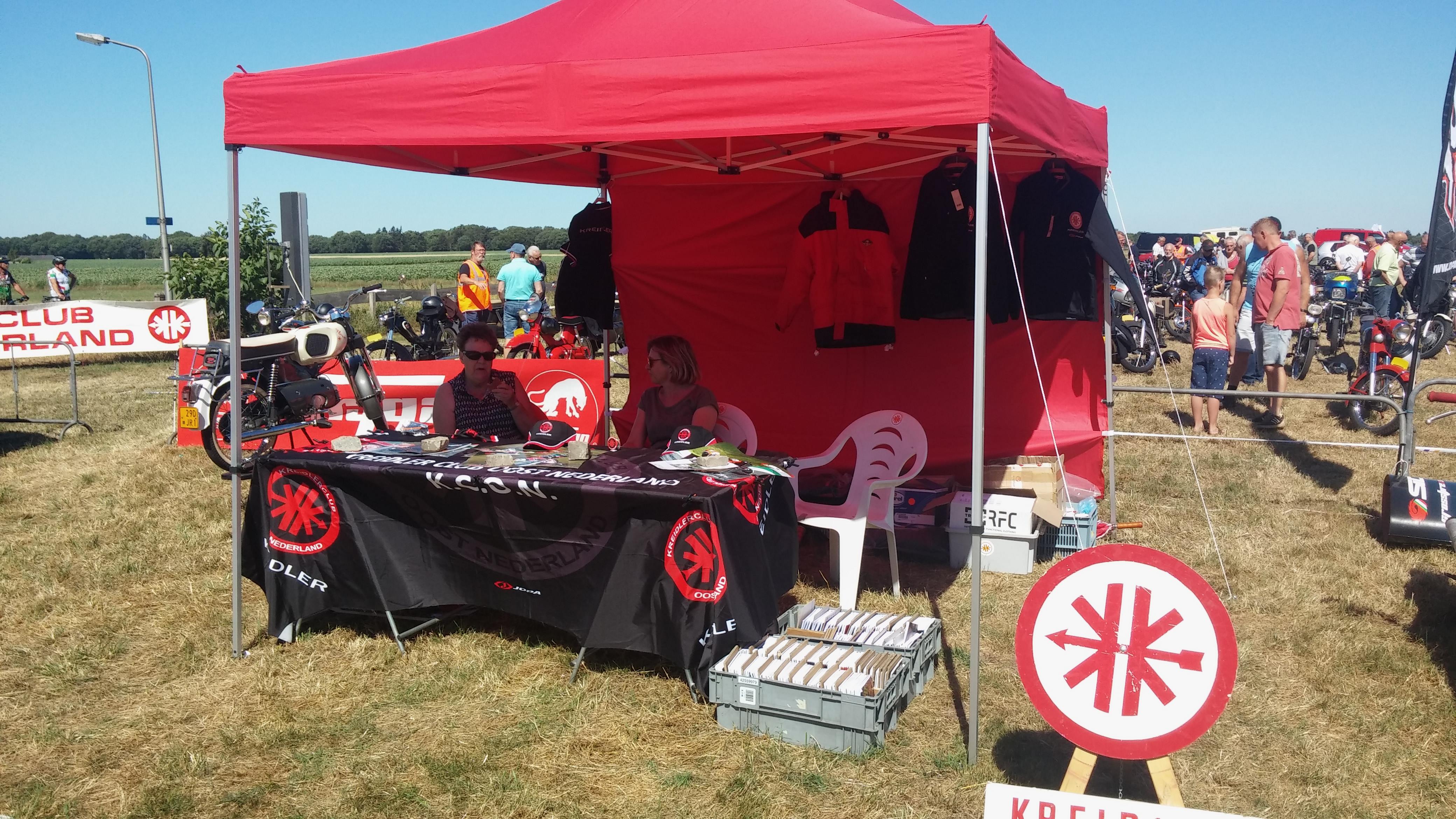 Ik was dit keer van plan weer eens mee te rijden, de voorgaande jaren lukte dat niet omdat ik toen andere werkzaamheden had als penningmeester. In Neede aangekomen hebben we de geluidsinstallatie uitgeladen, het draaiplateau geplaatst en daarop mijn brommer geplaatst. Andere clubleden/vrijwilligers waren druk in de weer om de tenten te voorzien van stoelen en tafels.
