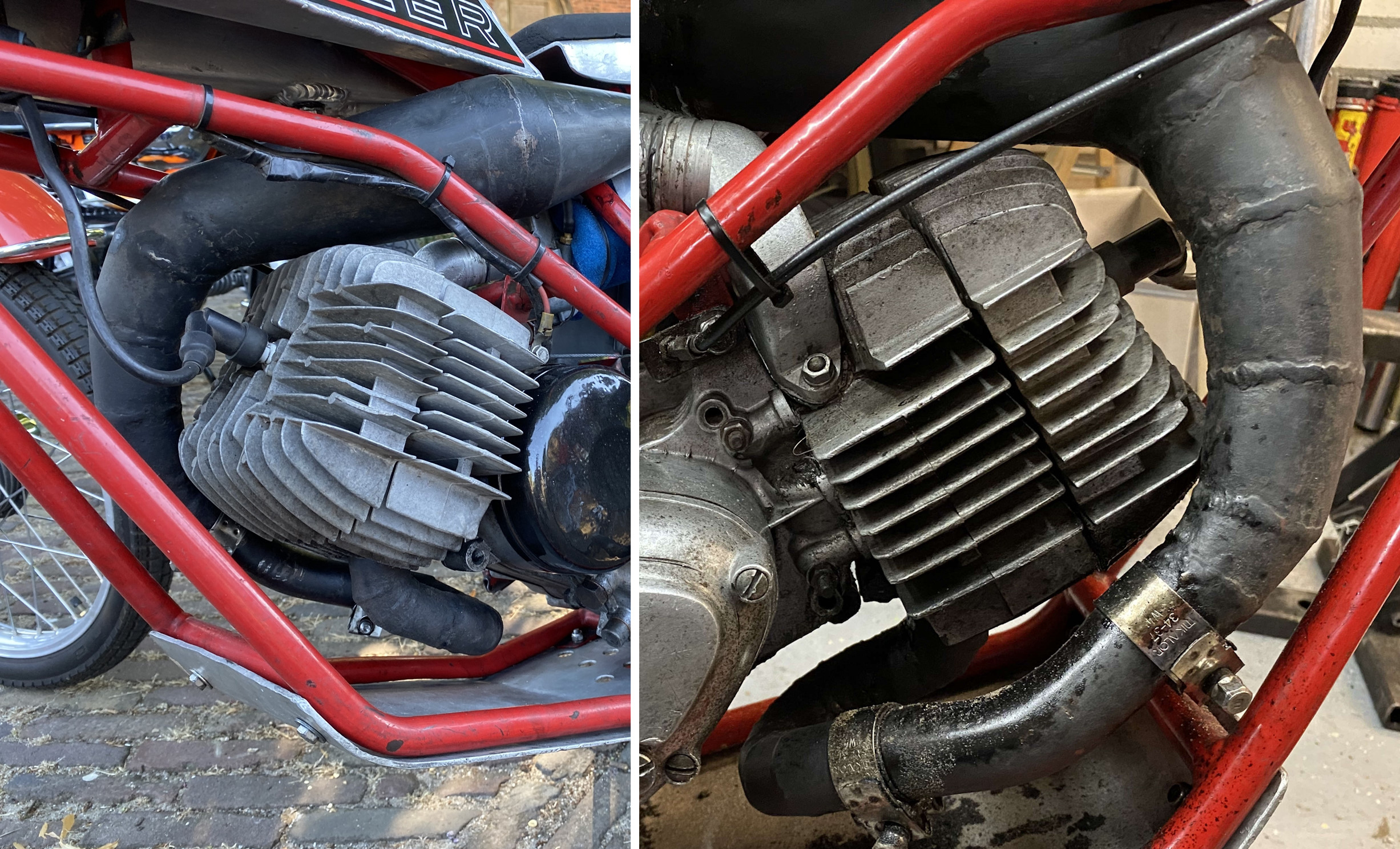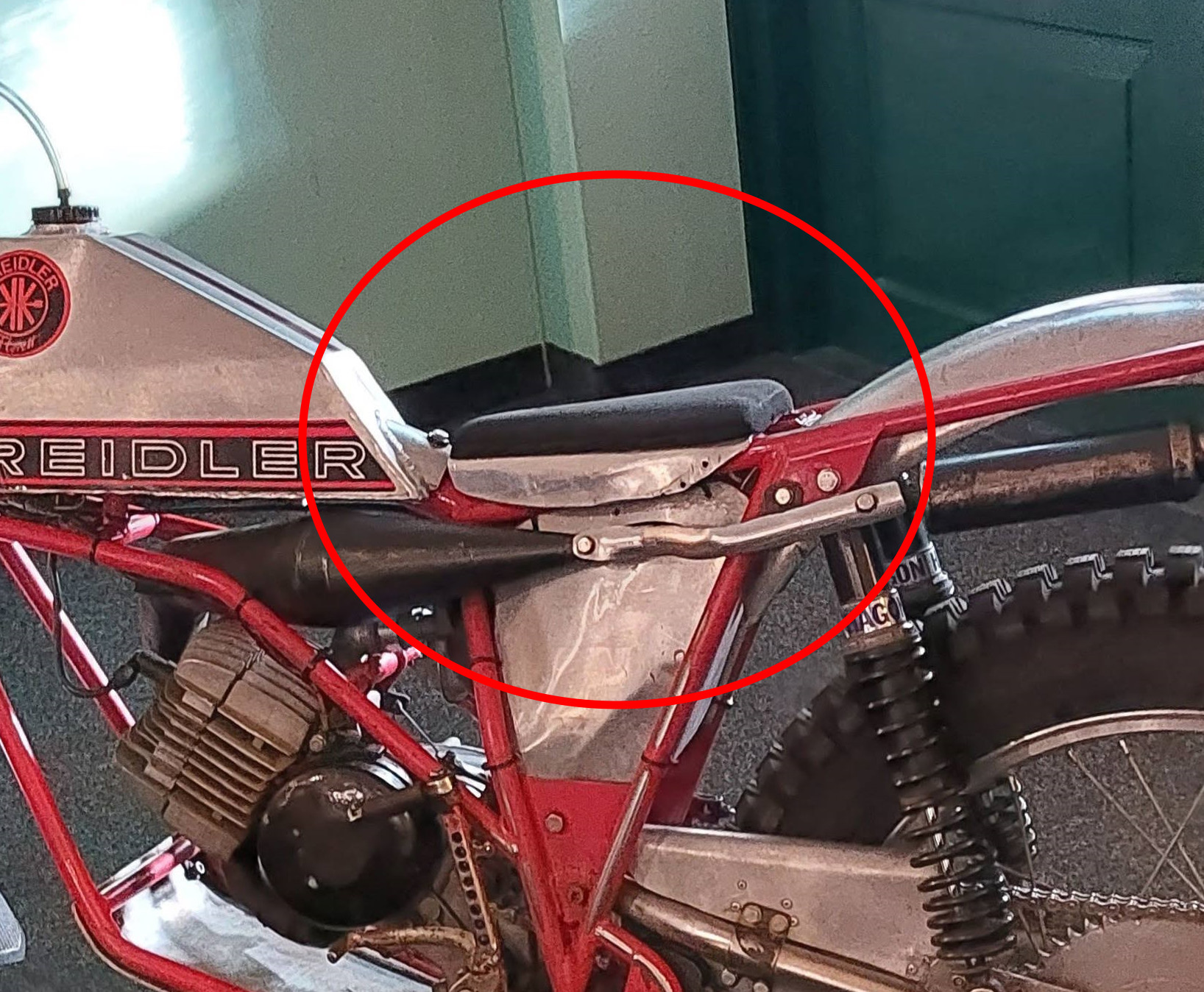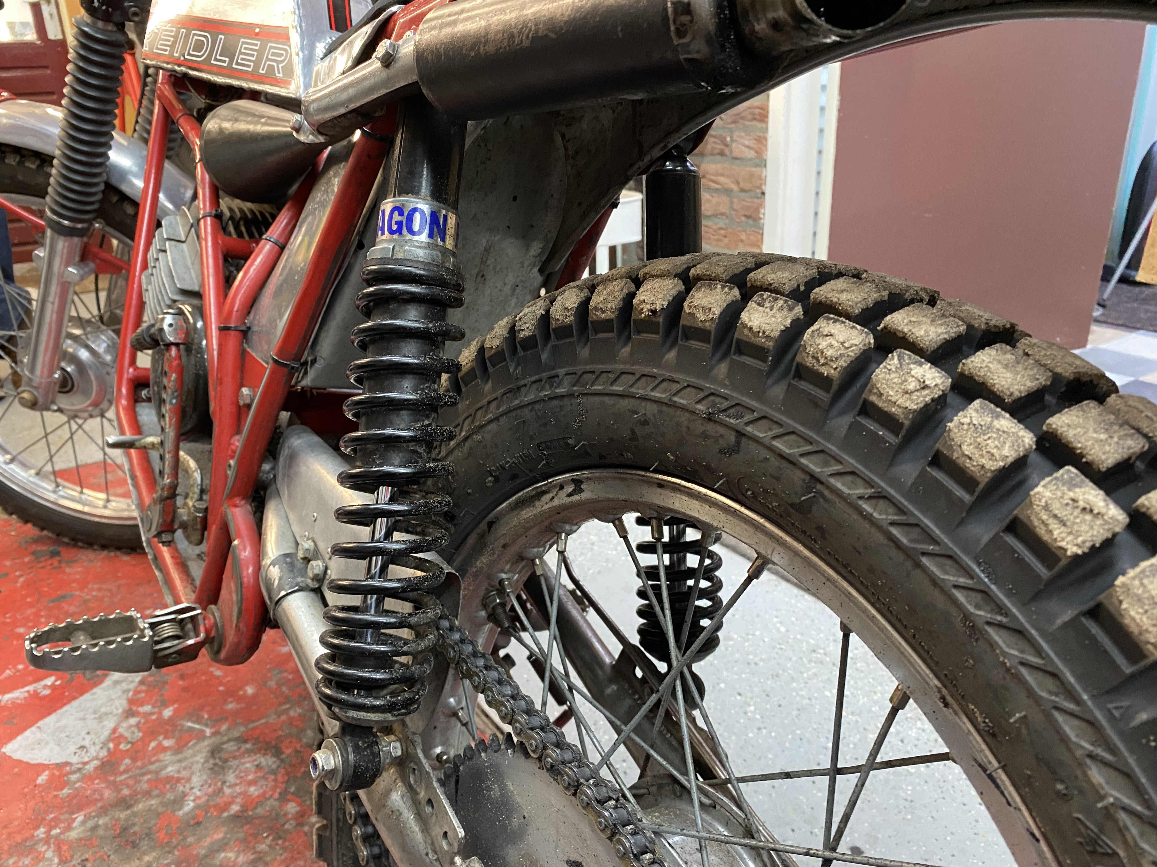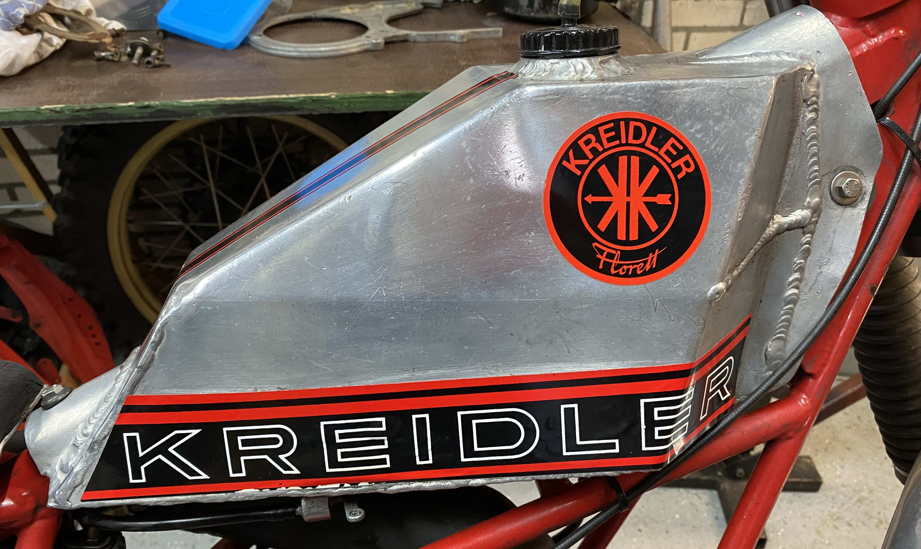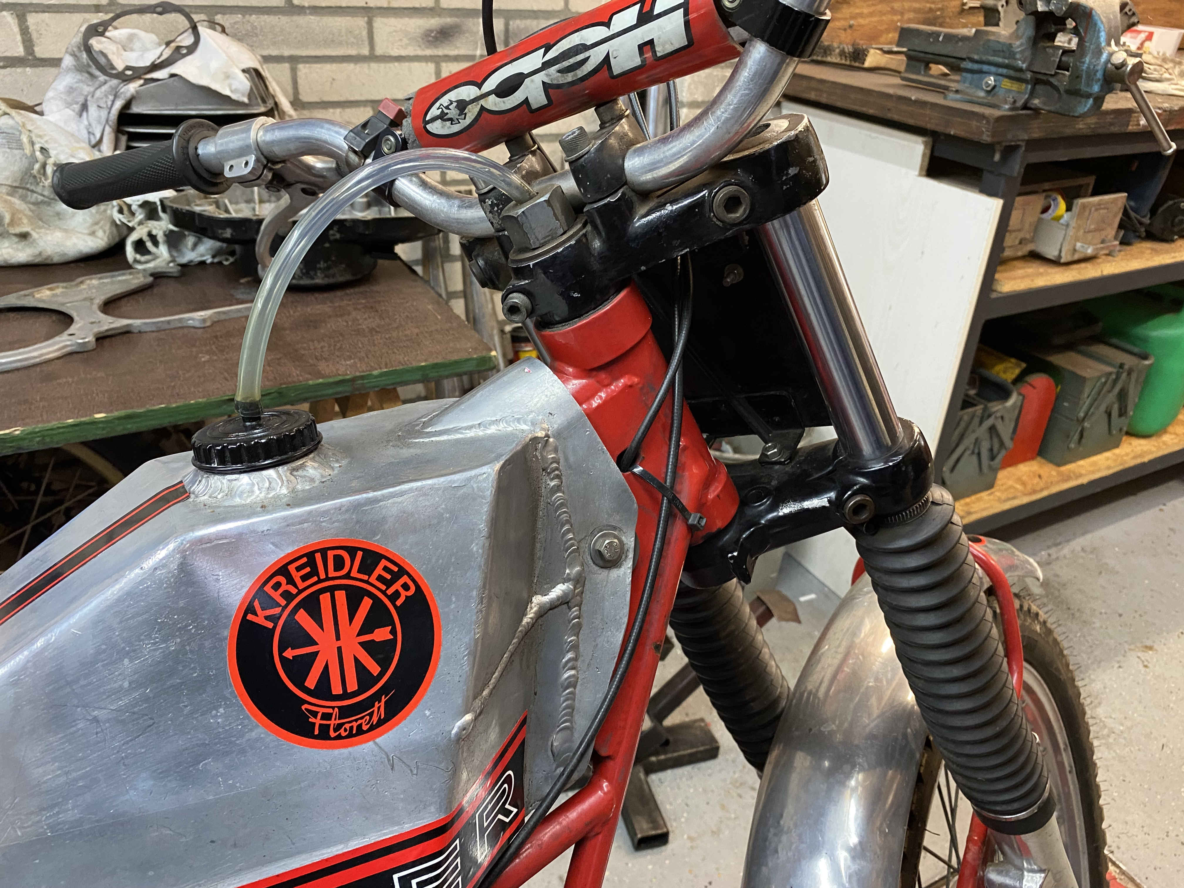 De Kreidler heeft de uitlaatpoort aan de onderzijde. De uitlaat heb ik in stukken gezaagd en weer aan elkaar gelast, zodat deze nu hoger zit en minder kwetsbaar is. Het was de uitlaatpijp van een Renault, want die had de goede diameter. De demper is van Kreidler, maar ook die is in stukken gezaagd en weer in elkaar gelast, zodat hij netjes om en over de motor heen liep. Ook de onderste buizen van het wiegframe lopen ter bescherming onder de motor door. Ook zit daar een beschermplaat voor de motor. De koelribben van de remtrommels heb ik afgedraaid; dat is makkelijker schoonmaken.