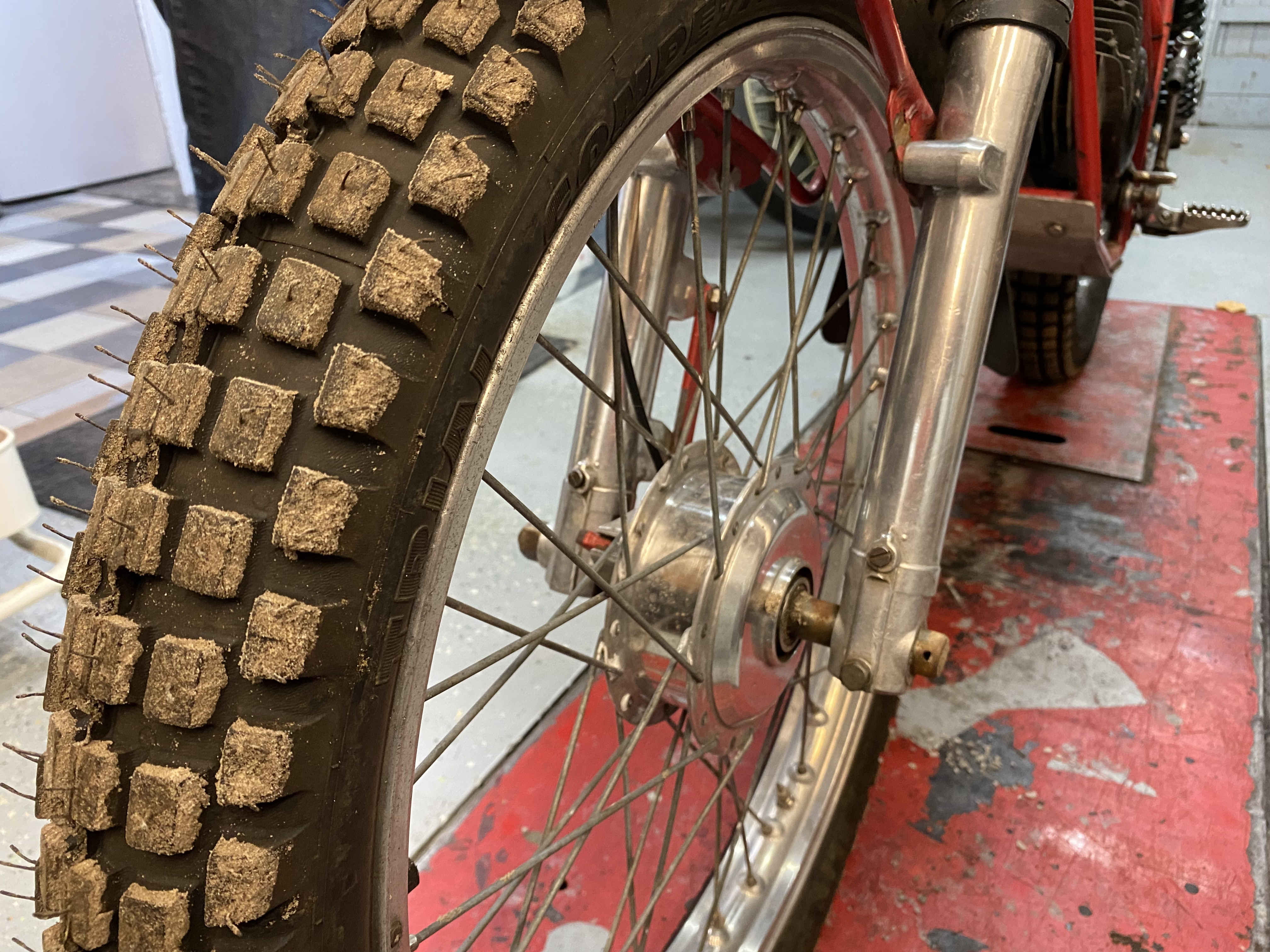 Om goed trial te rijden is het van belang, dat je heel snel je gewicht kunt verplaatsen, naar voren en achteren en zijdelings. Daarom zijn de opklapbare voetsteunen meer naar achteren geplaatst dan bij een gewone bromfiets. Daardoor kan de voorkant van de motor vrij licht gebouwd worden om makkelijker over een obstakel heen te kunnen rijden. Als je omlaag rijdt, moet je niet voorover op het stuur hangen. Je moet zorgen dat er druk op de wielen blijft. De voorwielmaat is 21 inch. Op de wielen zijn noppenbanden gemonteerd. Deze zijn speciaal voor trial en hebben slappe wangen. Door de lage luchtdruk van 0,4 bar ontstaat er heel veel grip. En als je uit de blubber of zandbak komt raakt je dit ook weer snel kwijt.