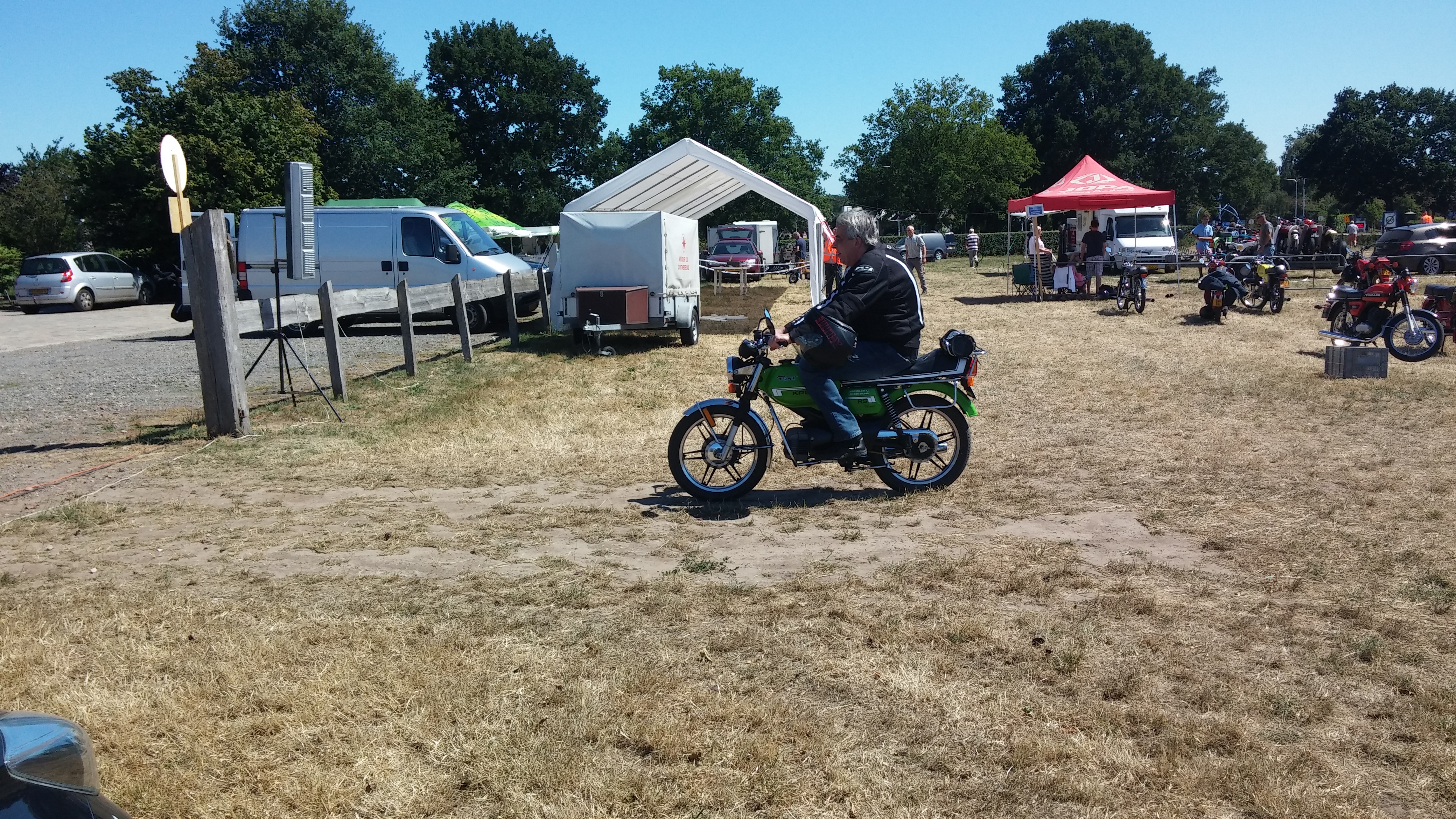 Ik was dit keer van plan weer eens mee te rijden, de voorgaande jaren lukte dat niet omdat ik toen andere werkzaamheden had als penningmeester. In Neede aangekomen hebben we de geluidsinstallatie uitgeladen, het draaiplateau geplaatst en daarop mijn brommer geplaatst. Andere clubleden/vrijwilligers waren druk in de weer om de tenten te voorzien van stoelen en tafels.
