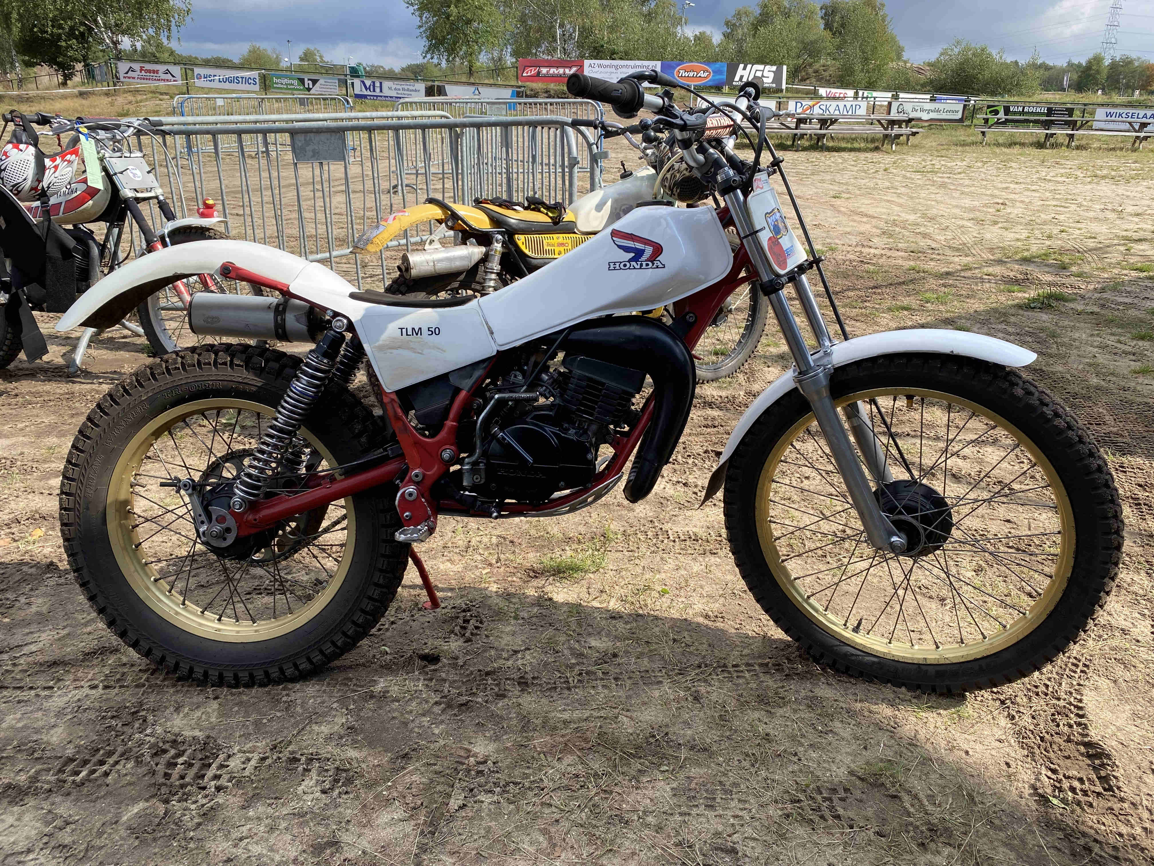 Wat is het leuk om naar trial te kijken. Er rijden speciale trialmotoren, maar ook klassiekers, zoals Sparta, Matchless, en Norton. De klasse, waarin Gijs rijdt, heeft speciale eisen, o.a. geen schijfremmen, geen monoshock achter maar dubbele veerpoten. En er is geen leeftijdsgrens. Ik zag daar behalve Gijs ook oude coryfeeën uit de crosswereld, zoals Stef van der Sluis en Chris van Homoet op een trialmotor. Het gaat bij trial niet om snelheid, maar om de beheersing van de motor; voetje aan de grond is een strafpunt.