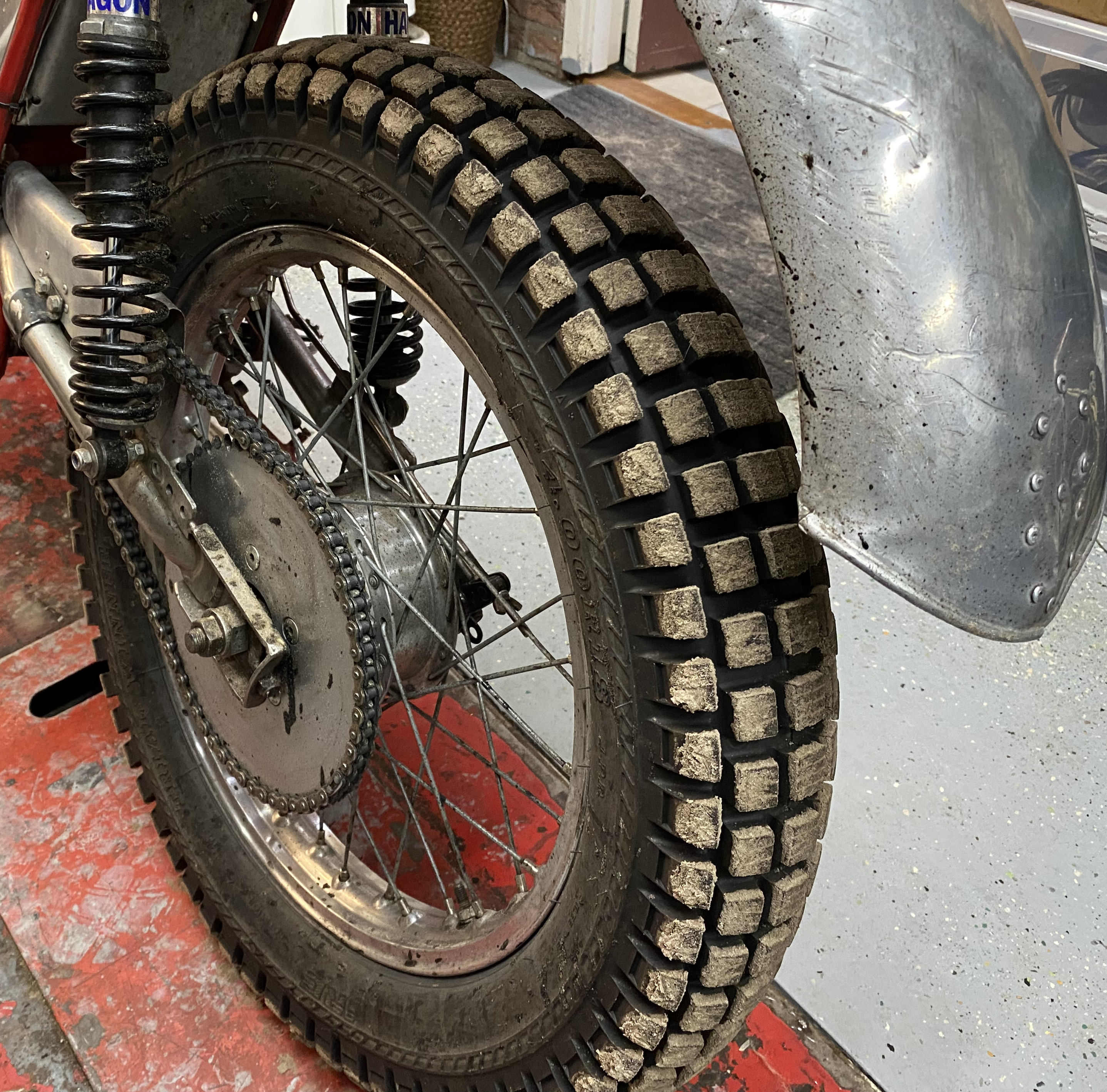 Om goed trial te rijden is het van belang, dat je heel snel je gewicht kunt verplaatsen, naar voren en achteren en zijdelings. Daarom zijn de opklapbare voetsteunen meer naar achteren geplaatst dan bij een gewone bromfiets. Daardoor kan de voorkant van de motor vrij licht gebouwd worden om makkelijker over een obstakel heen te kunnen rijden. Als je omlaag rijdt, moet je niet voorover op het stuur hangen. Je moet zorgen dat er druk op de wielen blijft. De voorwielmaat is 21 inch. Op de wielen zijn noppenbanden gemonteerd. Deze zijn speciaal voor trial en hebben slappe wangen. Door de lage luchtdruk van 0,4 bar ontstaat er heel veel grip. En als je uit de blubber of zandbak komt raakt je dit ook weer snel kwijt.