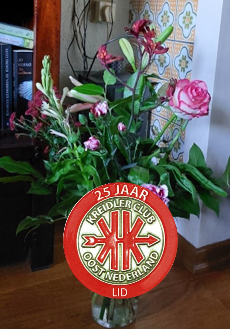 De met X gemerkte leden waren op de receptie aanwezig en kregen van onze voorzitter de oorkonde en het speldje uitgereikt. Voor de dames was er een prachtig boeket bloemen. Zoals in het vorige boekje vermeld was ik zelf ook bij de jubilarissen. En zoals altijd gold ook hier ik snappe nie woar de tied e bleem is. (Ik snap niet waar de tijd gebleven is). In die 25 jaar heb ik aan heel wat evenementen/tourritten meegedaan zowel bij onze eigen als bij andere clubs of dorps/stadsfeesten. De keuze om ergens te rijden in het weekend is enorm. De eerste rit was in Heerde bij Gerwin van Bennekom op 29 mei 1999 (Let op ik ben in 1998 lid geworden want toen heb ik mijn rode 69er aangeschaft en met behulp van diverse mensen gerestaureerd). Helaas is de heer van Bennekom vorig jaar afgehaakt als KCON lid. Maar om terug te komen op de receptie: Er werd veel bijgepraat. De mannen zullen wel over brommers/motoren gepraat hebben en de dames over de (klein kinderen). Dat bedoel ik niet kleinerend maar zo gaat dat ook met verjaardagen. Tegen 17.00 uur was de receptie ten Einde. Ik denk dat we kunnen terug kijken op een leuke middag. Later dacht ik nog eens bij mijzelf, misschien is het iets om in de toekomst bij de winterdag een soort ,,kletsmiddag,, te organiseren om zo maar wat met elkaar te praten. Ik zal het eens aankaarten bij het bestuur.