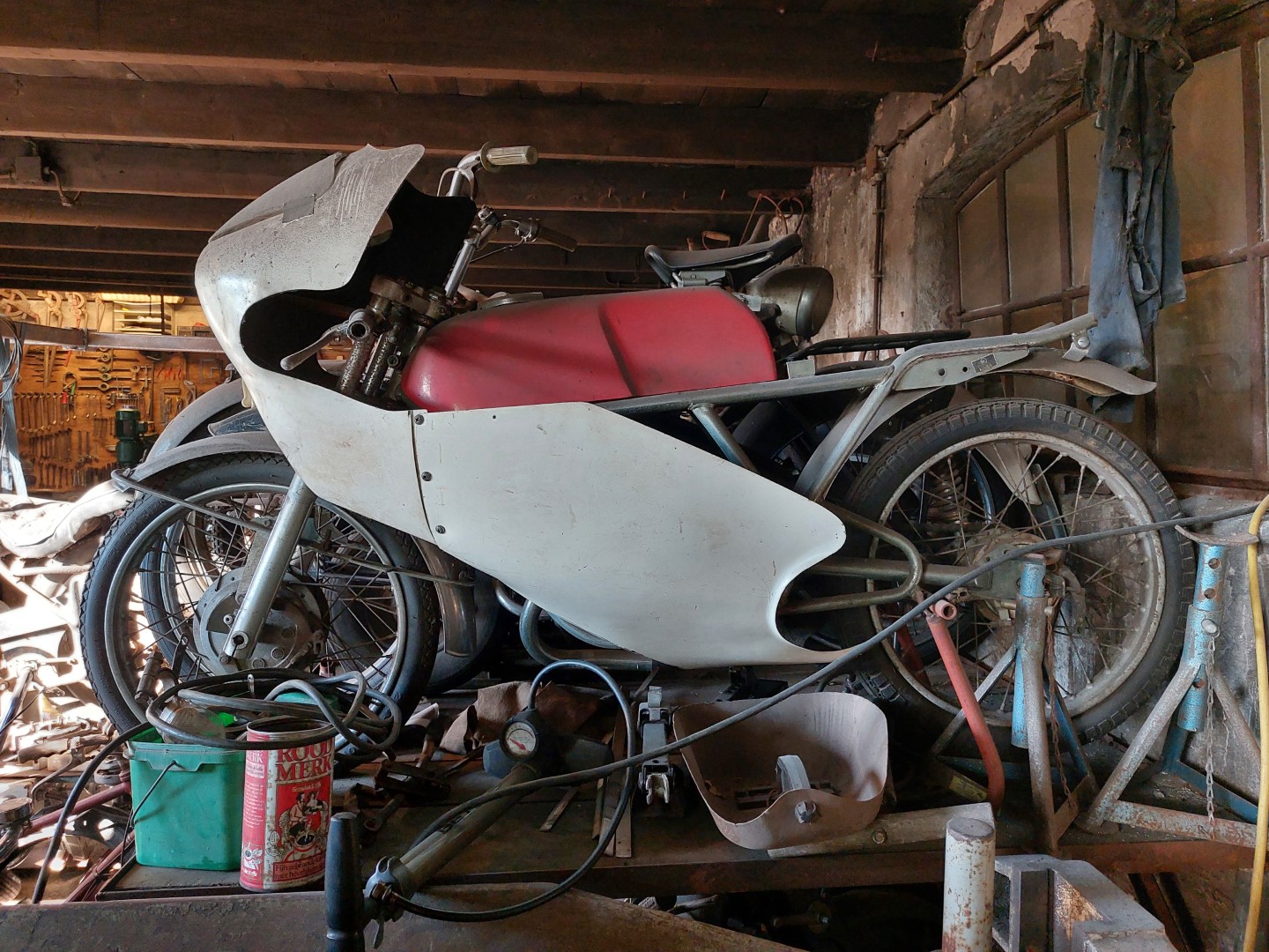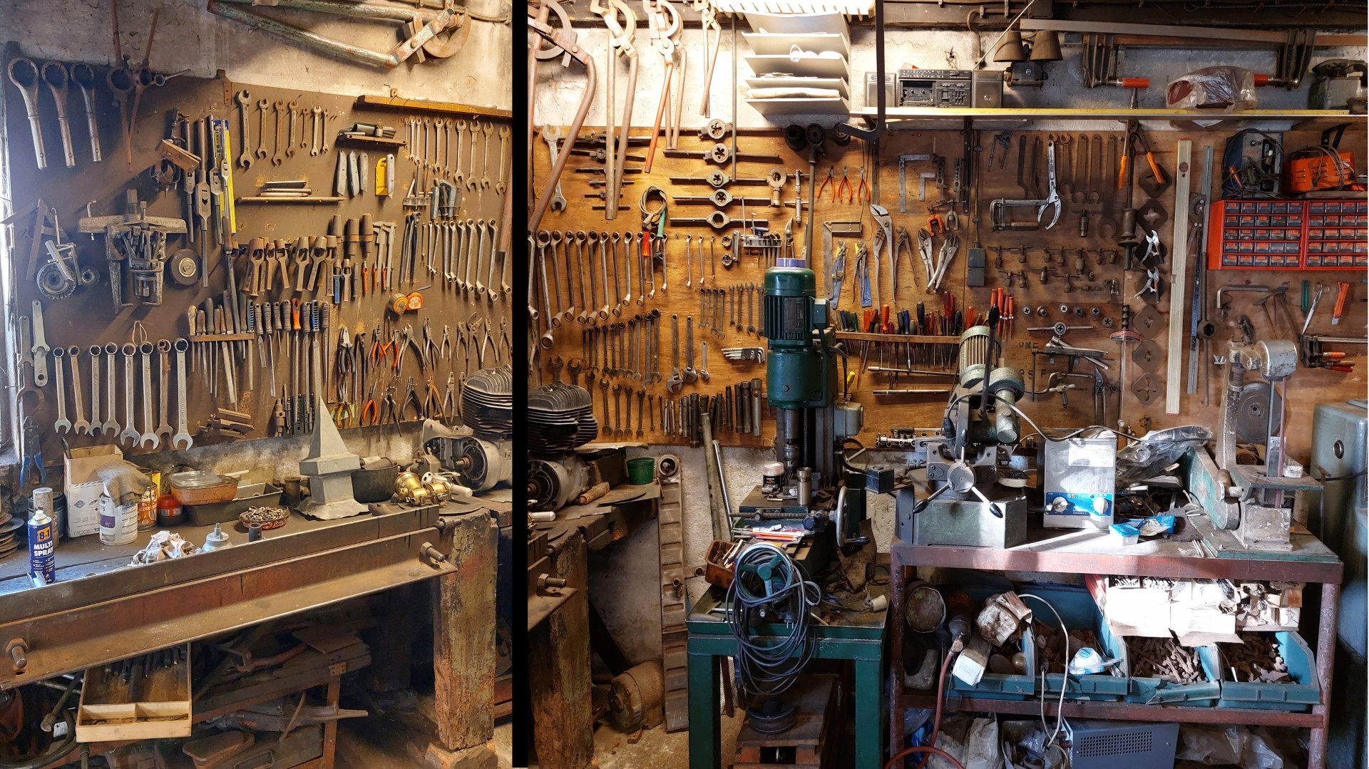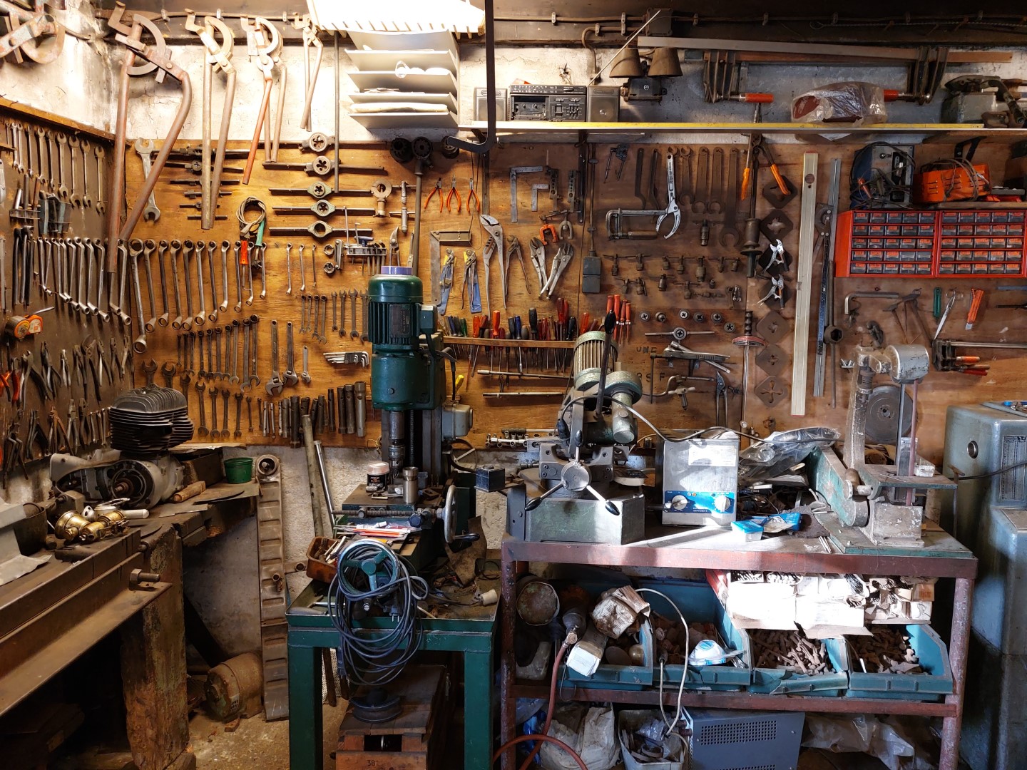 Qua gereedschap is er ook van alles: wanden vol sleutels, tangen schroevendraaiers snij en tap gereedschap voor schroefdraad, enz. enz. Niet het nieuwste gereedschap maar wel functioneel En natuurlijk ontbreekt ook een draaibank en een boormachine niet.