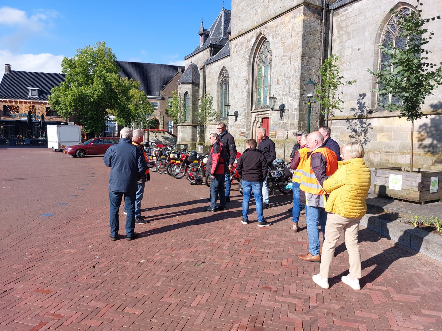 In de kerk is door bronzen randen aangegeven hoe deze door de eeuwen heen is uitgebreid. De rit ging om 18.30 van start na een bakje koffie, aangeboden door een kennis van het drietal die de rit organiseerden. Martin reed voorop en Han was de hekkensluiter. Globaal reden we de volgende route: Haaksbergen, (Oostdorper) Watermolen, Rekken, Duitsland in, Zwillbrocker Venn (Hier in de buurt “woont” ook ergens een flamingo kolonie), Ellewickerfeld en dan naar de Duitse plaats Vreden met ongeveer 23.000 inwoners. Hier hadden we een pauze midden in het dorpspark. Het laatste stukje hier naar toe moesten we eigenlijk onze brommers uitzetten om dat het park fiets en brommer vrij is. (Kwam niet zoveel van terecht)