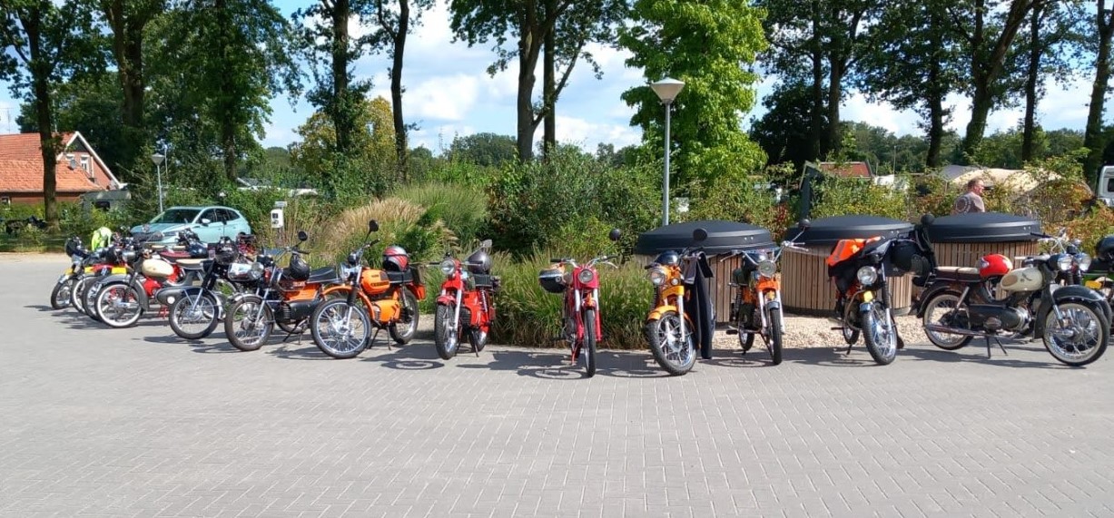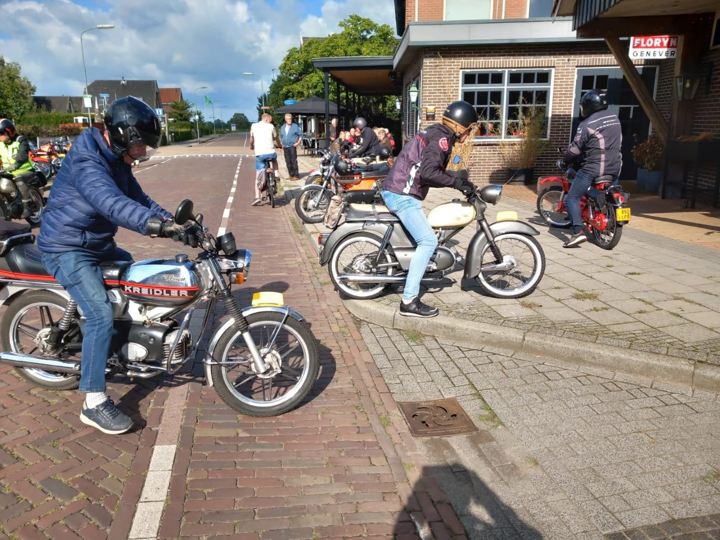 Uiteindelijk stonden er 44 brommers (43 heren en 1 dames) mooi in het gelid. Oud inwoner van Vragender Willie Spexschoor kwam uit Beltrum met een Benelli T50 aangereden en trok natuurlijk de aandacht. Het weer was prima en de koffie smaakte goed. Na een woord van welkom door Wilfried, werd er in 3 groepen gereden met een voorrijder en met een ,,Tom-Tom ,, op het stuur, (Werner, Wilfried en Cyril). Rond de klok van 11.00uur ging het licht op groen. Na een rondje door het dorp ging het langs de ruïne uit 1444 (Voormalige St. Jacobskapel ) en vervolgens richting Corle, rondom Winterswijk, Ratum, Kotten naar de uitbater ,,Italiaanse meren,,. Na een uurtje was menigeen toe aan tomaten soep, broodje kroket en koffie.