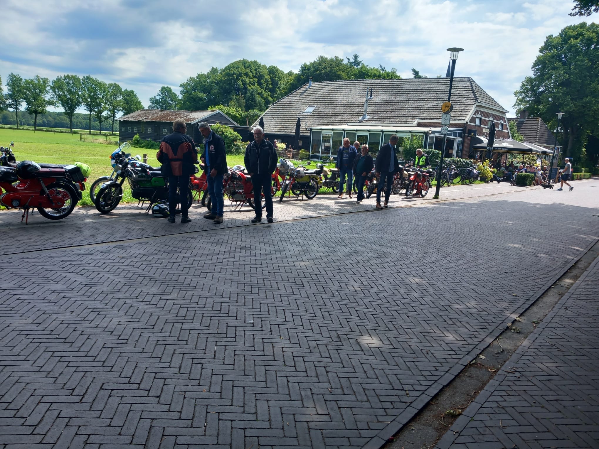 Zaterdag ochtend 12 juli om 08:00 uur zijn we met de auto meet aanhanger vertrokken naar Veenhuizen (Drenthe). We zijn vanuit Haaksbergen vertrokken met 3 auto’s, en in Beckum hebben we Harry en Lidy Veldhuis nog even opgepikt, en die zijn ook aangehaakt. Met 4 auto’s variërend met fietsen en brommers achter op, in 1 stoet richting Drenthe. Dat liep allemaal super voorspoedig, en omstreeks kwart voor 10 kwamen we aan Bij het huis adres van Alwin en Karla Meijer. We hebben de brommers en fietsen afgeladen en achter het huis van Alwin en Karla stond koffie met krenteweggen en cake klaar. We hebben even heerlijk in de mooie tuin van familie Meijer gezeten, en omdat er een groep van 2300 wielrenners precies op het tijdstip dat we wilden gaan vertrekken door de straat zou komen, zijn we 10 minuten voor 11 uur vertrokken aan de toertocht.
