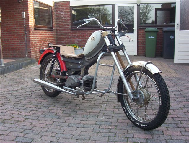 Ik kwam al snel tot de ontdekking dat er van de old-timer bromfietsen geen choppers waren en ben maar eens gaan zoeken wat je er voor nodig hebt, en dat was allemaal voorradig in mijn schuur.