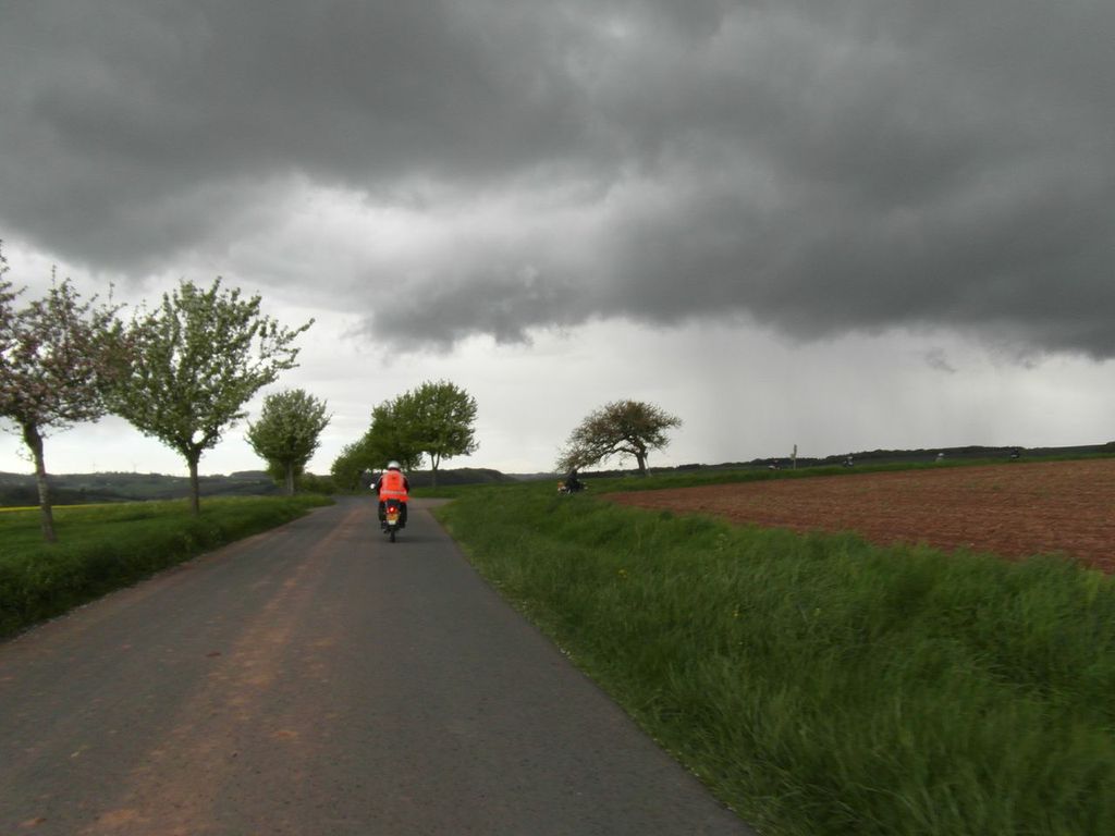 Net voor Bollendorf begon het te regenen, dus even een pitstop bij een Luxemburgs tankstation, waar we onder de luifel onze regenpakken aan konden trekken. Op dat moment begon het te stortregenen; de eigenaresse van het tankstation was niet geamuseerd van ons oponthoud en verzocht ons vriendelijk te vertrekken