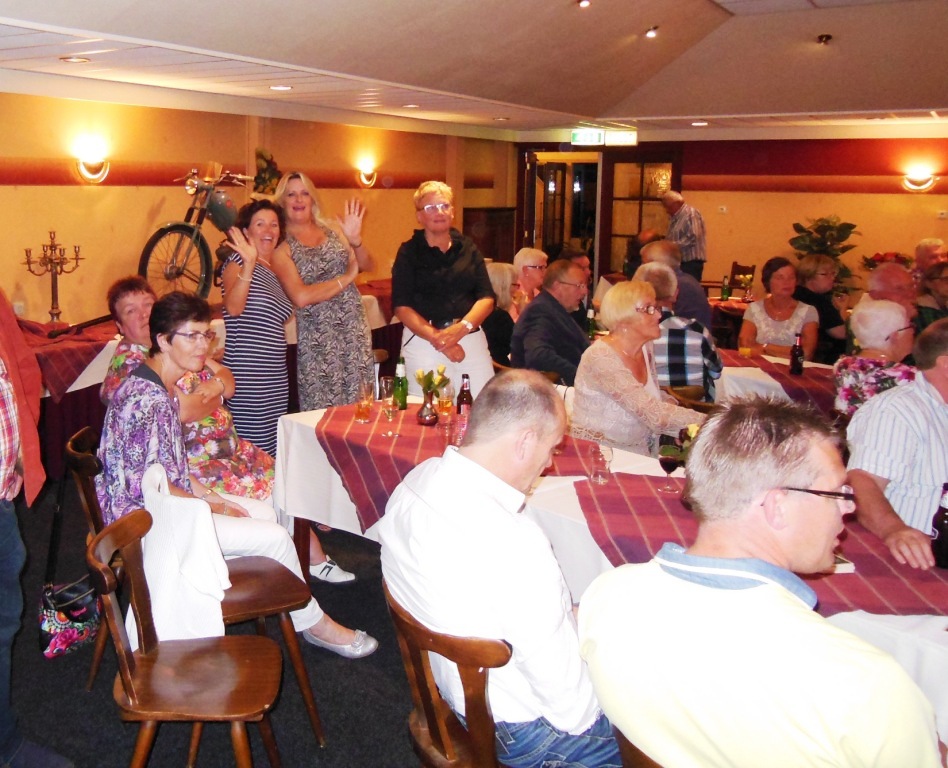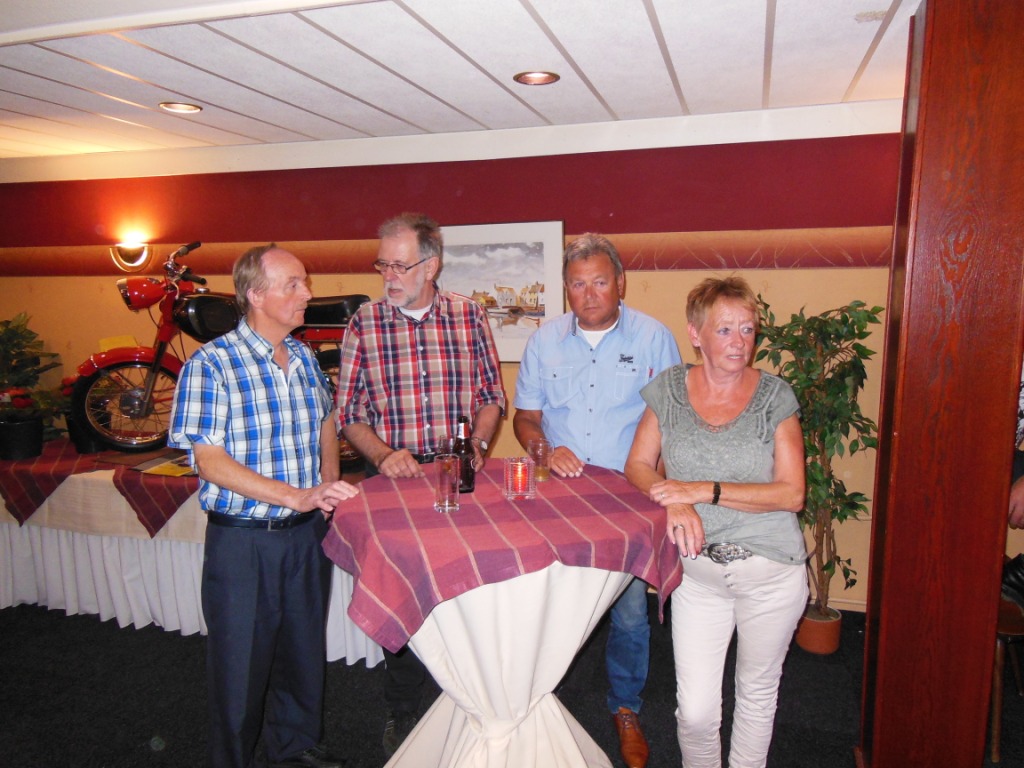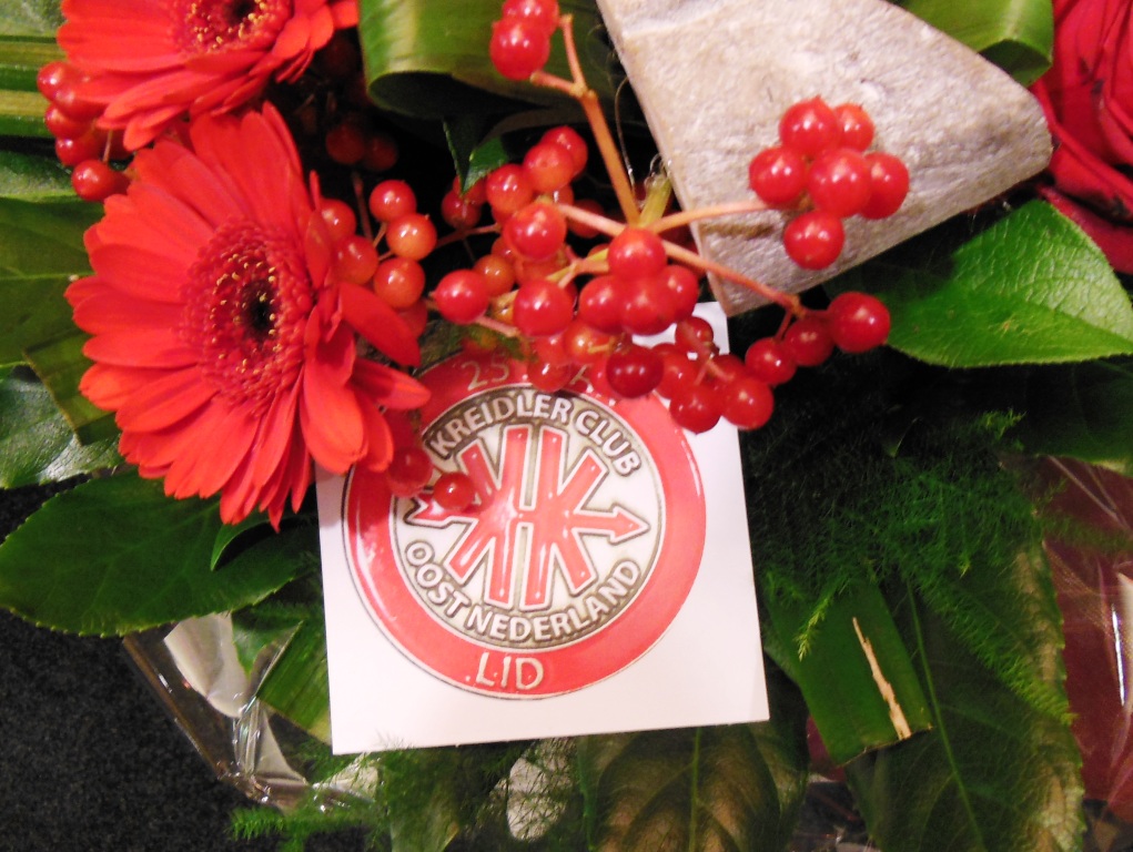 Op 23 augustus 2015 was het precies 25 jaar geleden dat onze club officieel werd opgericht Ter gelegenheid van dit heugelijk feit is er door een door het bestuur aangestelde feestcommissie e.e.a. georganiseerd. Als eerste is er door de commissie veel georganiseerd tijdens het bromfietstreffen op 5 juli. Op de exacte oprichtings datum was er een prachtige tourrit uit gezet. En als laatste evenement tijdens dit jubileumjaar was er op 29 augustus een feestavond bij de Olde Mölle te Neede. Jammer dat het volledige bestuur niet aanwezig kon zijn. Wat ook jammer was, was de magere opkomst van de leden. In z’n totaliteit waren er ca 80 mensen inclusief partners en enkele sponsoren. Dat viel erg tegen. Van de aanwezige leden waren er ca 35 met partner. Dus in totaal hadden zich 80-35 = ca45 leden opgegeven. Op een ledenaantal van 315 is dit (om niet te zeggen bar) erg weinig. Toch waren er ook mensen die van ver gekomen waren ondermeer uit Arnhem , Noord Holland, Joure en uit Veenhuizen in Drenthe. De gezelligheid was er echter niet minder om. De muziek speelde nummers uit de 60 en 70er jaren,schitterend. Al hoorde ik zo hier en daar er zit geen Beatles of Rolling Stones bij. Persoonlijk had ik enkele Nederlandstalige nummers uit die tijd ook wel mooi gevonden. Dit blijf je houden, smaken verschillen nou eenmaal. Wat mijns inziens bij iedereen in de smaak viel was de demonstratie van de Rock and Roll groep. Het was een wervelende show. De avond werd op een uitstekende manier aan elkaar gepraat door ceremoniemeester Ben Dorenbusch. Hij had ook de taak om de aanwezige bestuursleden van het eerste uur en die nog lid zijn van onze club in het zonnetje te zetten en een speldje op te spelden met de tekst Kreidler Club Oost Nederland 25 Jaar Lid. Dit waren de heren Bok , Beumer en Libbers. Ook een speldje kregen de heren Wilderink , Hekman en Leferink. Deze waren ,,gewoon,,25 jaar lid. Er schenen echter nog enkele leden aanwezig te zijn die ook 25 jaar lid waren maar geen speldje hebben gekregen. Onze secretaris heeft toegezegd dit uit te zoeken.In de toekomst zullen leden die 25 jaar lid zijn met de nieuwjaarsreceptie worden gehuldigd. Ook de inwendige mens is niet vergeten er was een royaal hapjes/koud en warm buffet. Het smaakte voortreffelijk. Door dat er met het bromfietstreffen met de verloting niet alle prijzen eruit waren gegaan, werden op deze avond enveloppen uitgedeeld met hierin al dan niet een bonnetje voor een prijs. Ikzelf kon me gelukkig prijzen met een mini fietsbel. Aan alles komt een eind , dus ook aan deze feestavond. Om 24.00 uur was het afgelopen (precies zoals in de 60 en 70er jaren). Ik vond het een geslaagde avond!! Op naar de volgende 25 jaar………..alhoewel? Hoe oud hopen we dan te zijn ???