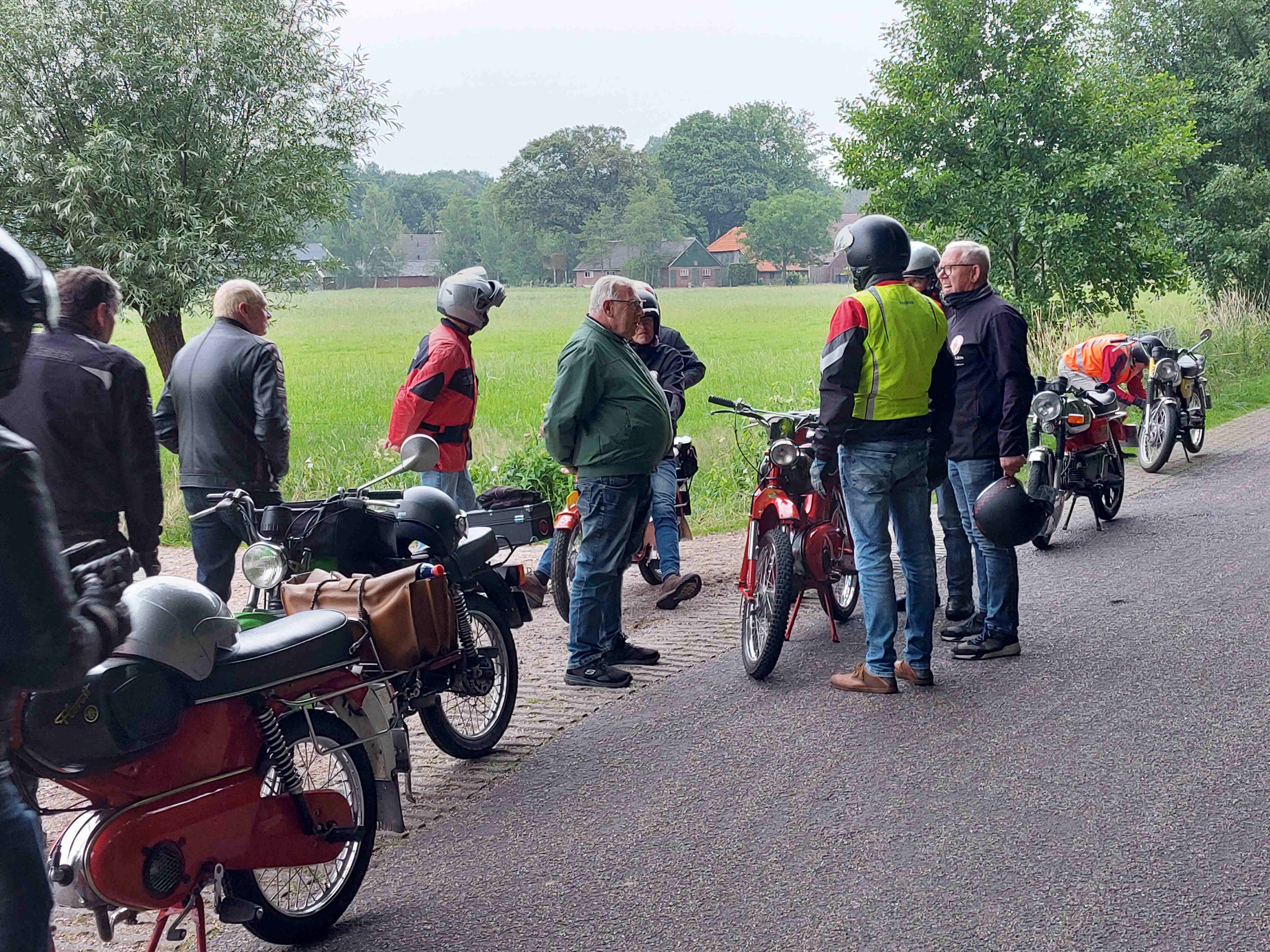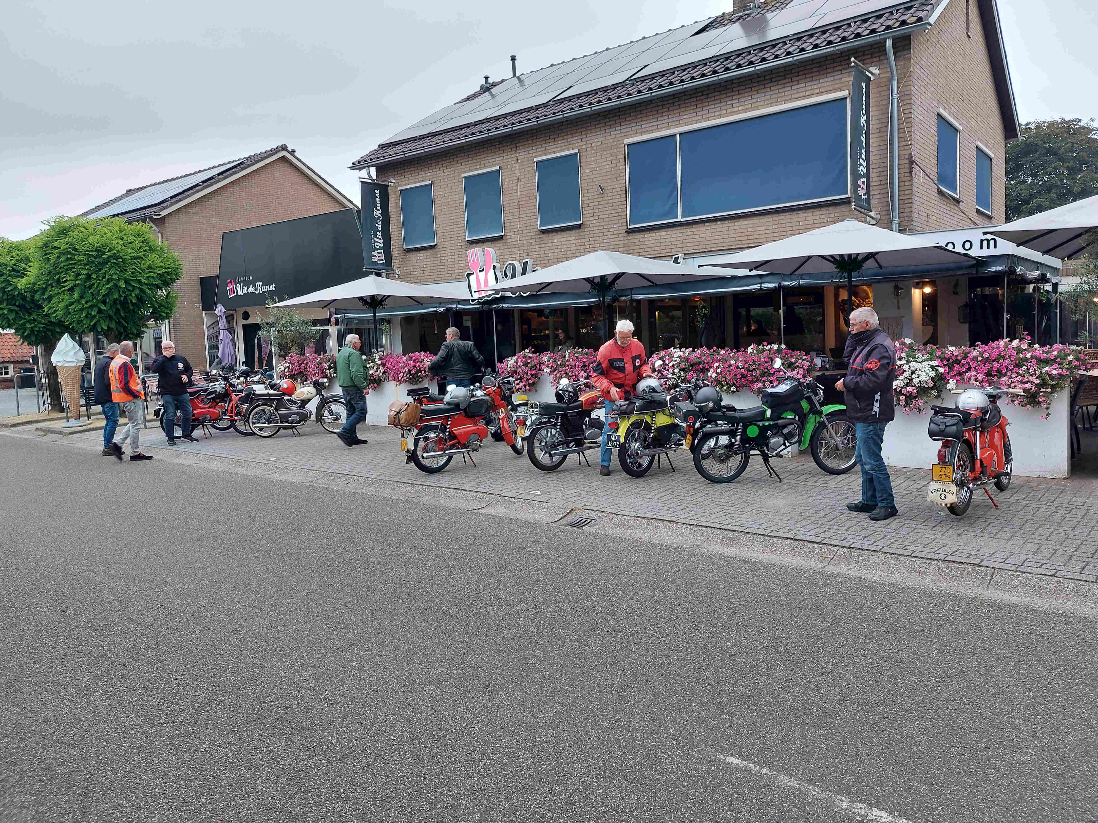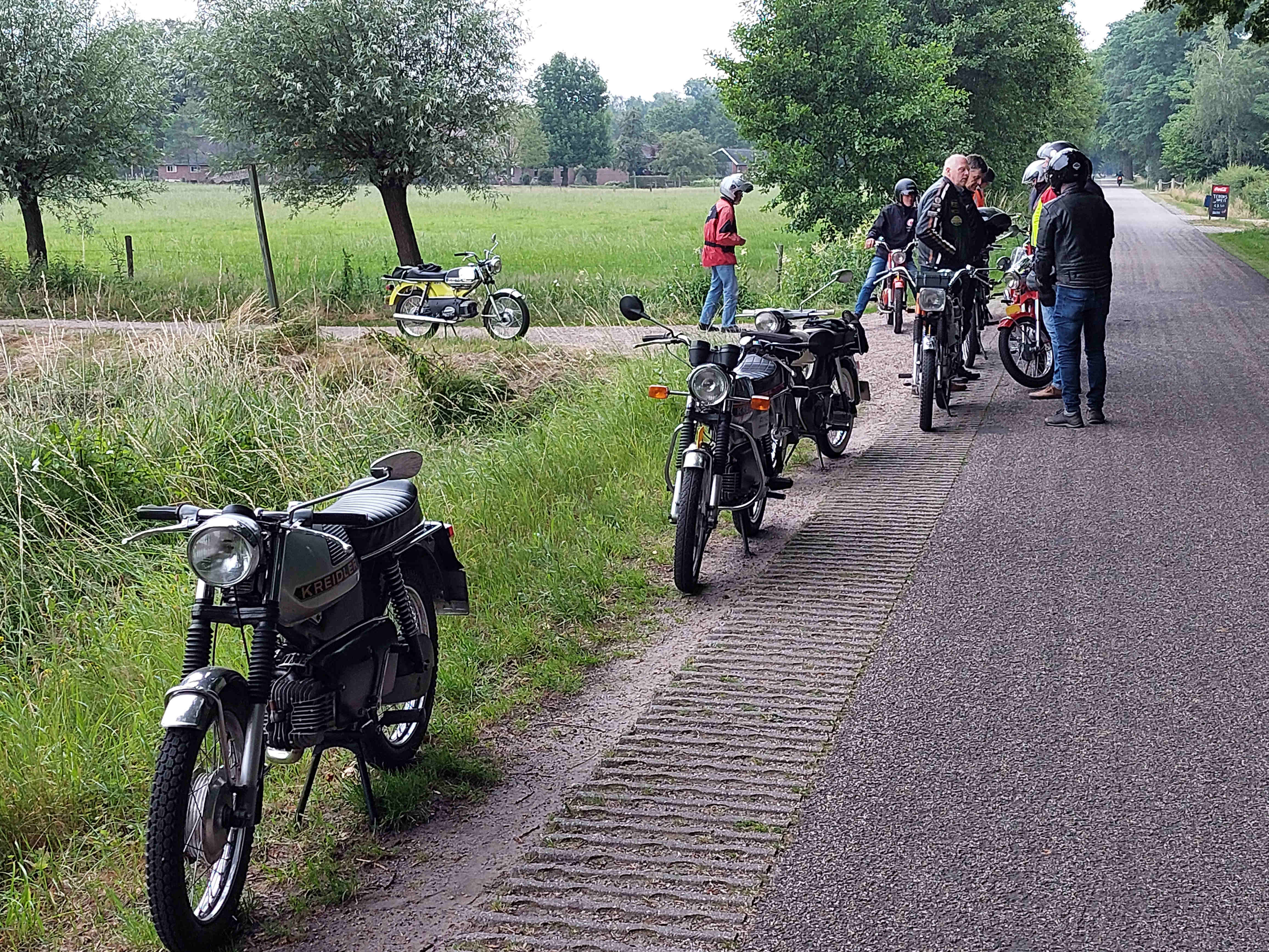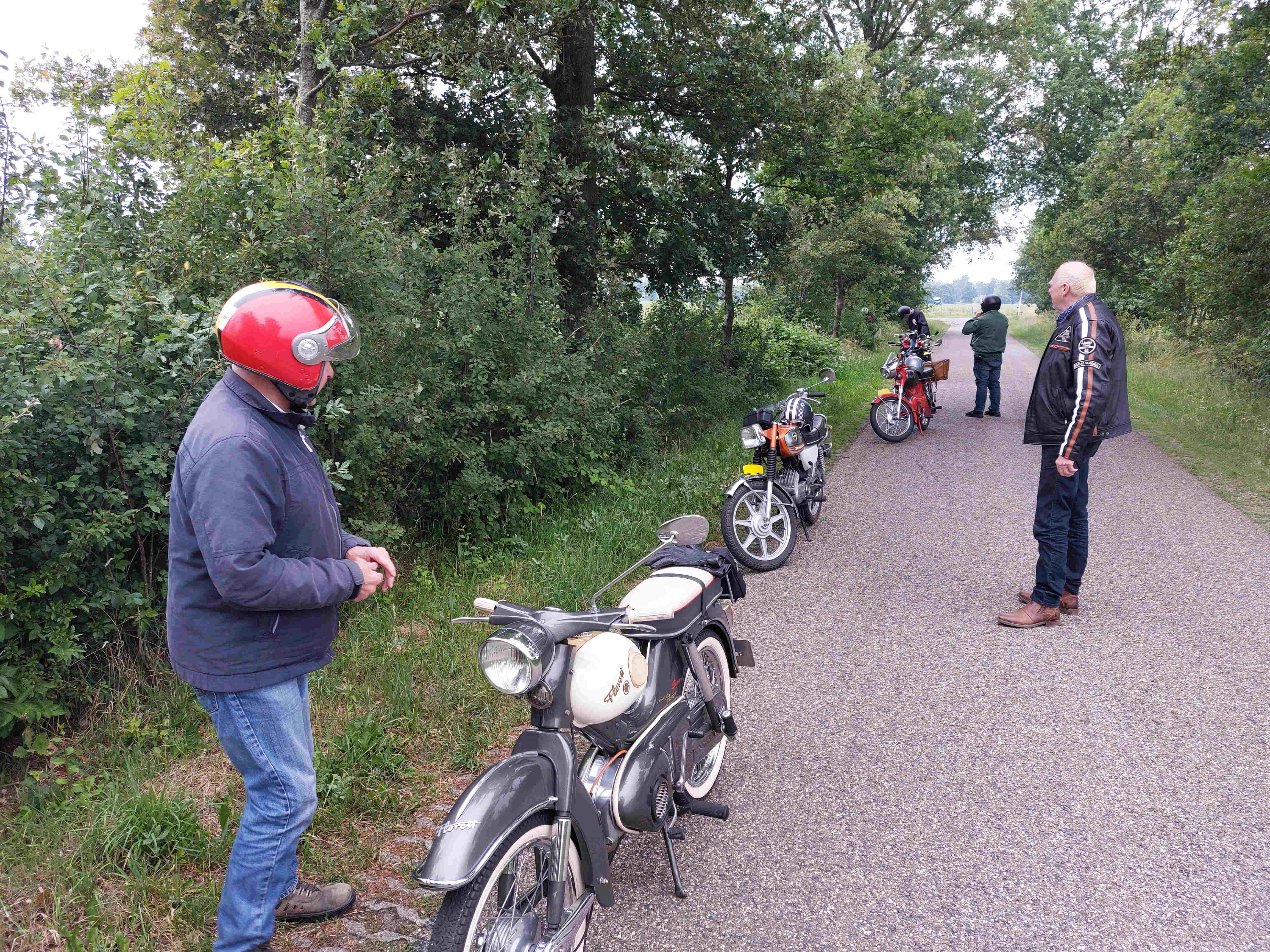 De rit verliep goed op een paar kleine probleempjes na. Van èèn weet ik het probleem niet en het andere probleem had ik zelf. Na het bezoek aan de ijstent was ik vergeten de benzinekraan weer open te zetten. De brommer hield er dus mee op. Ik kreeg hem echter niet weer aan de praat. Net toen ik dacht ik zal de bougie er maar eens uitdraaien kwam hij weer tot leven. Wat het weer betreft was het droog, persoonlijk vond ik het nogal fris. Tegen 21.00 uur waren we weer terug bij Herberg de Pot.