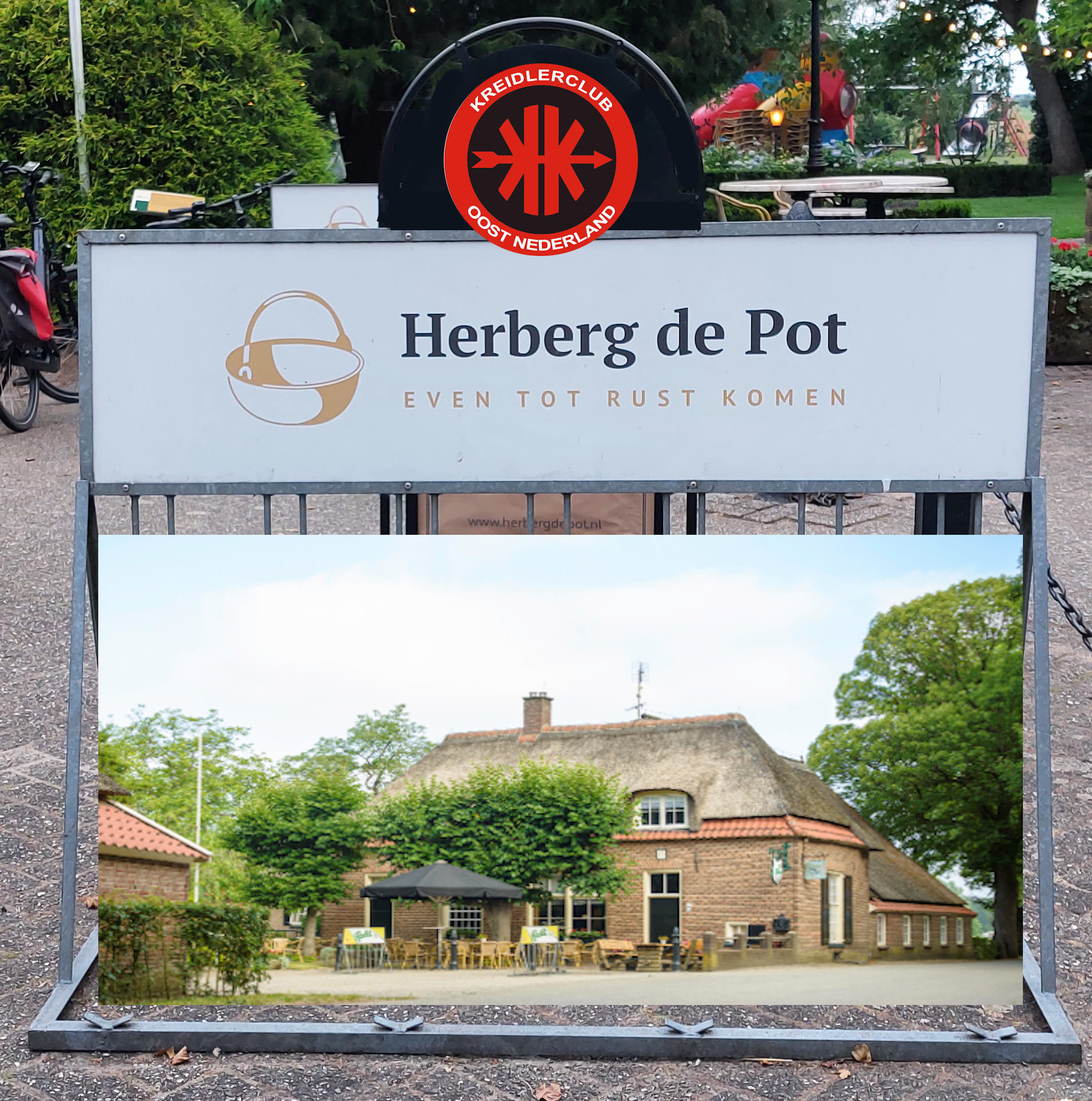 Dat was, toen we daar buiten zaten de kippen over onze tafels vlogen. Echter toen ik in de omgeving aankwam waarvan ik dacht hier moet het zijn, geen Potdijk te bekennen. Ik vragen aan een man die daar net de hond uitliet. Hij zegt je moet aan de andere kant van de rotonde zijn en dan rijden tot vlak voor Markelo en dan links af, dat is de Potdijk en daar is ook Herberg de Pot.