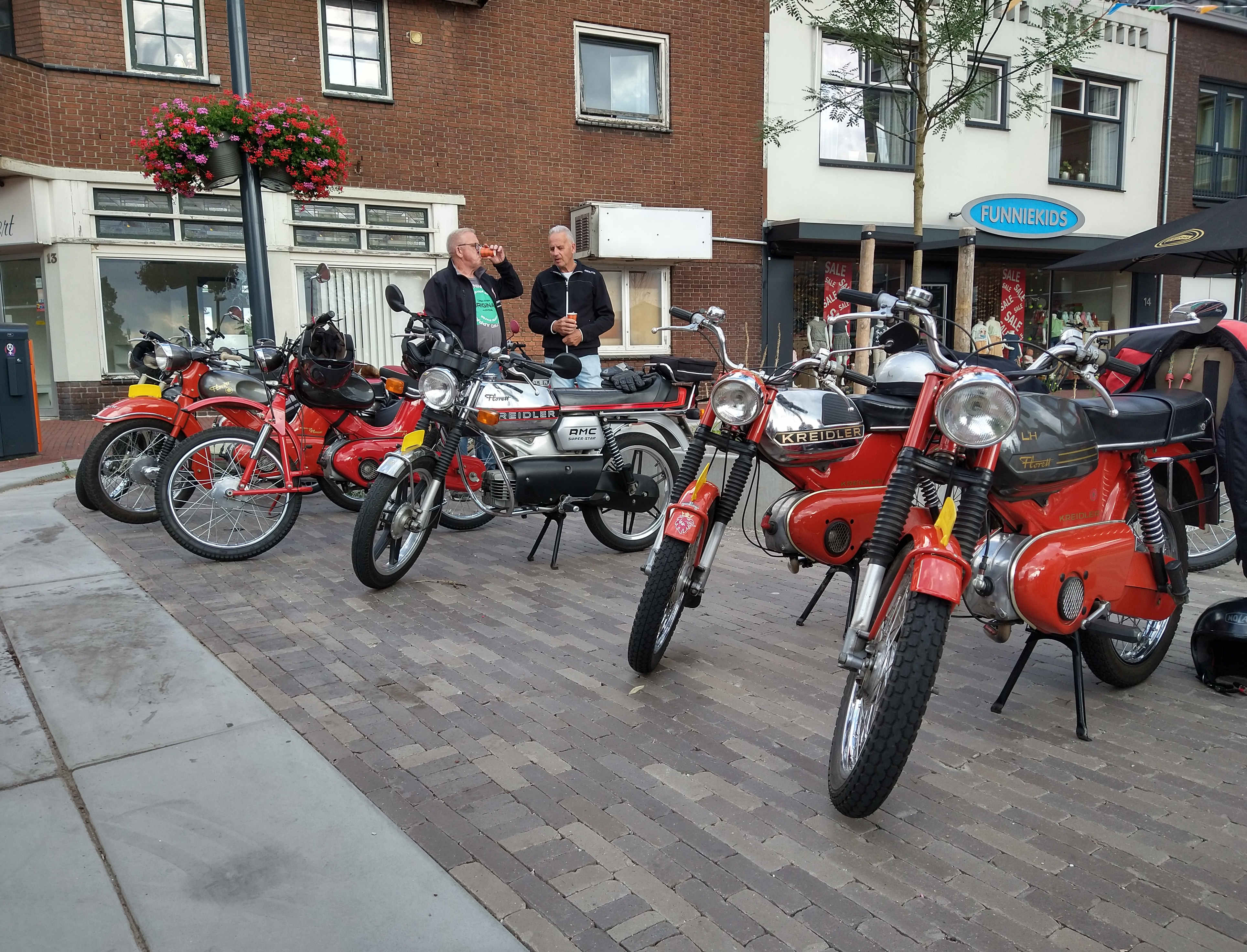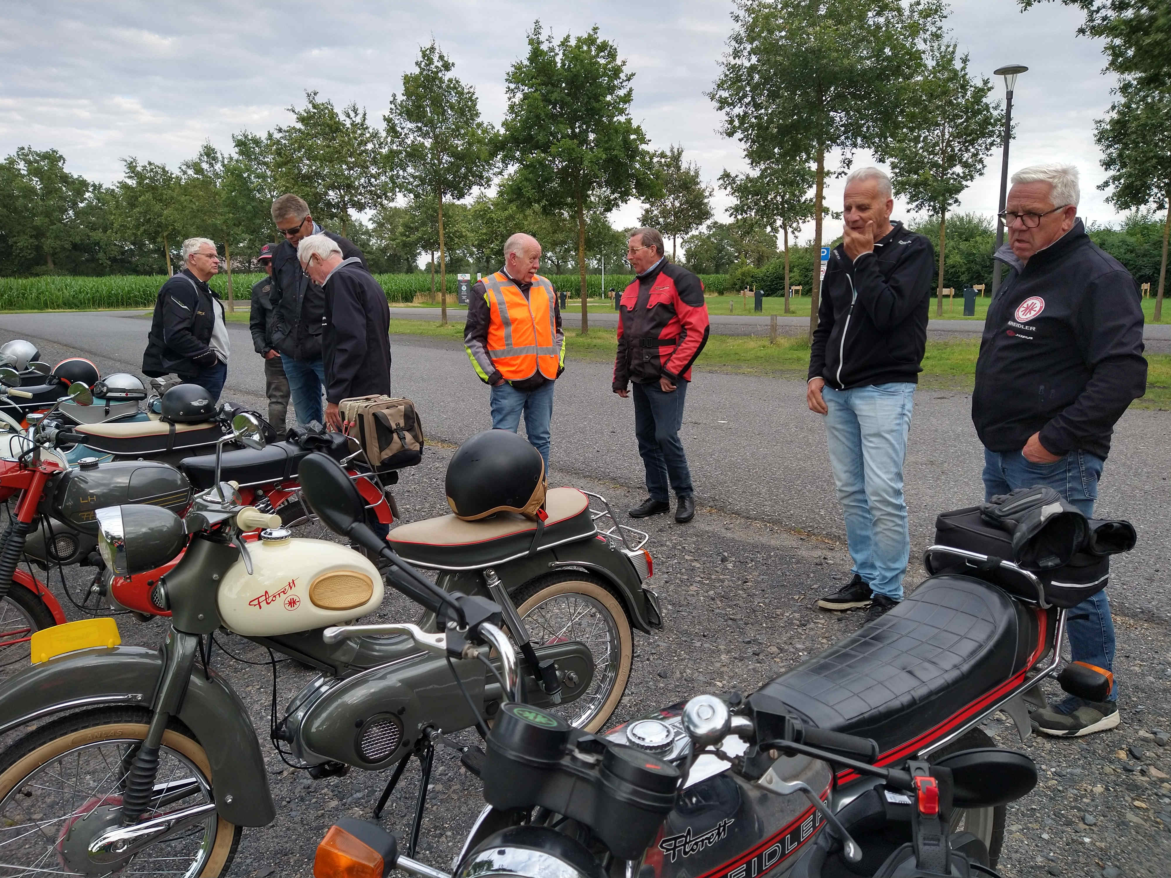 Om 18:00 uur kwamen de eerste rijders met hun Kreidlers. Na een kwartier waren wij met 12 rijders en op het moment dat wij wilden vertrekken, kwam Thomas nog aanschuiven. Uiteraard hebben wij gewacht tot ook Thomas de koffie op had.