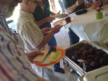 Bij terugkomst op de kaasboerderij hebben wij maar weer gelijk de plaatsen in de schaduw van de wilgen ingenomen en iets gedaan aan de droogte die alom voelbaar was. Jan en Johan hadden een menuutje geregeld met patat, frisse rauwkost en een gehaktbal. Vrijwel iedereen maakte hier dan ook gretig gebruik van.