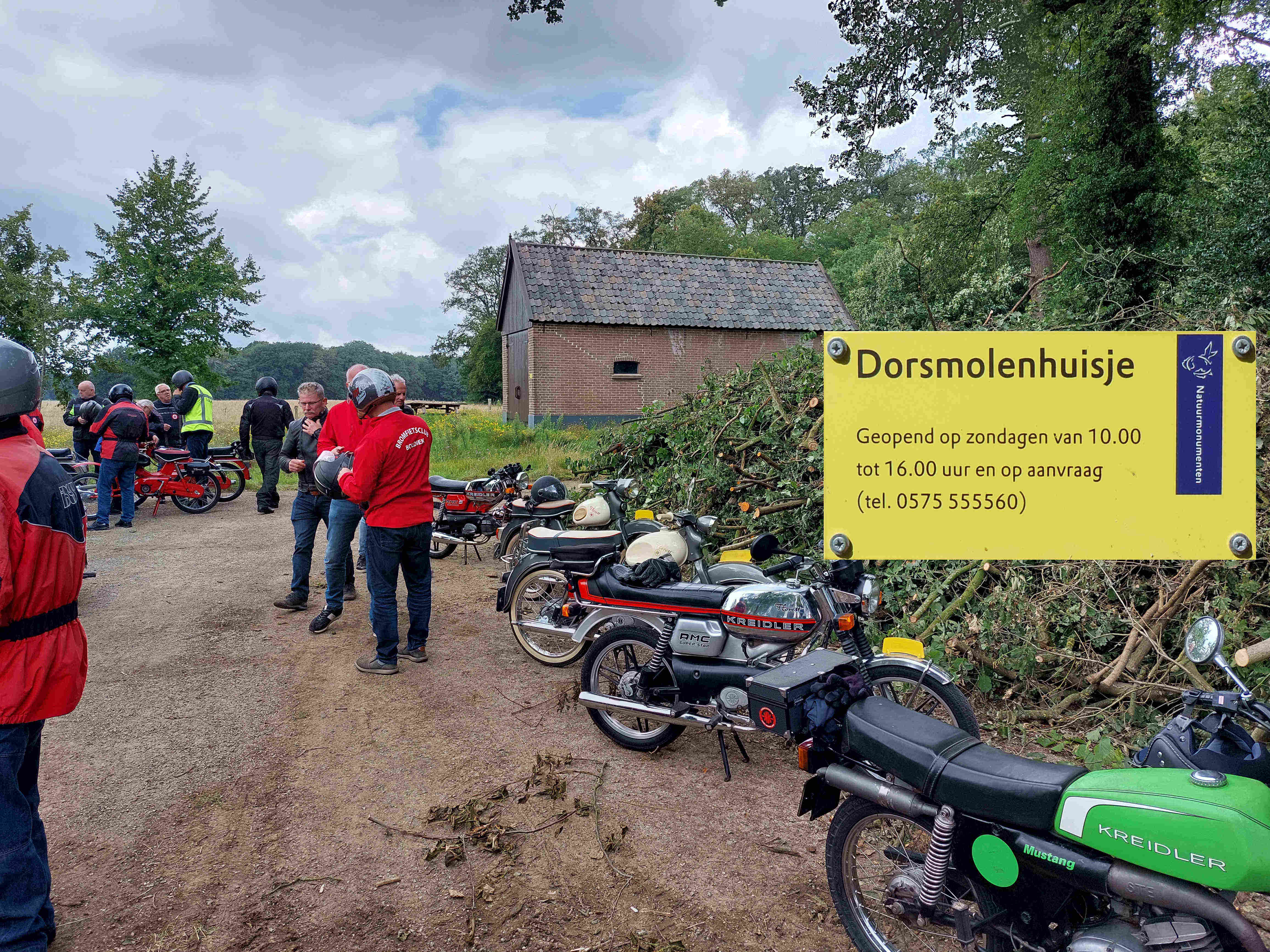Gelukkig was het droog toen we onze machientjes starten en richting Mariënvelde vertrokken. (Van oorsprong heet Mariënvelde Achter-Zieuwent. In 1952 kreeg het dorp de naam Mariënvelde) Vlak voor Mariënvelde sloegen we af richting Halle-Heelweg.