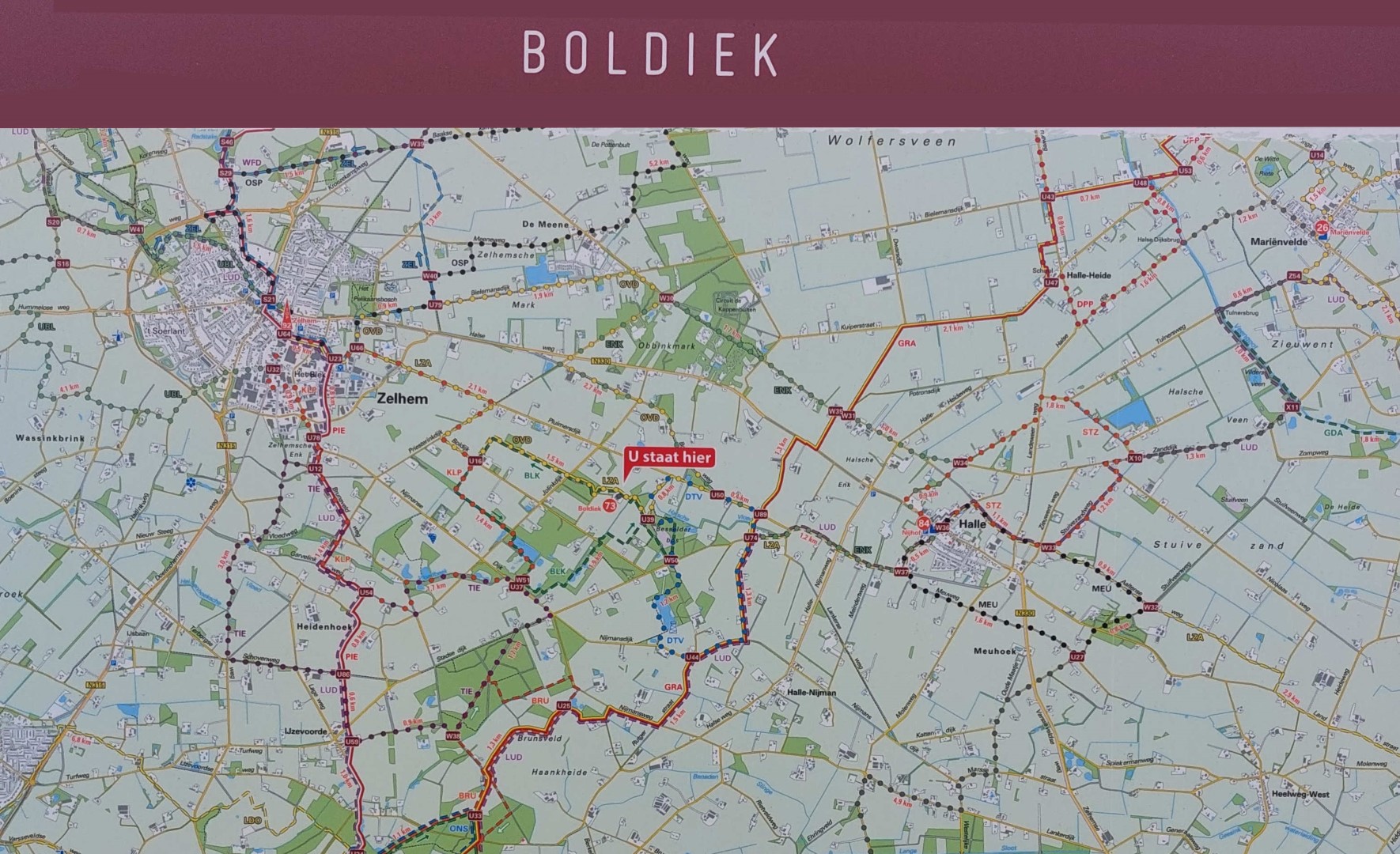 Na deze pauze reden we verder onderlangs de plaats Keijenborg (vroeger bekend om klompen) naar Zelhem, een plaats met 9000 inwoners. Als je in Zelhem komt, kun je niet om Smoks Hanne heen. Smoks Hanne is het beroemdste kruidenvrouwtje van de Achterhoek. Ze vloog altijd achterstevoren op haar bezemsteel en droeg veel te grote klompen, die bij het lopen over de grond sleepten. In het Achterhoeks heet dat smoksen. Van Zelhem reden we naar de Boldiek om te pauzeren en een hapje te eten.