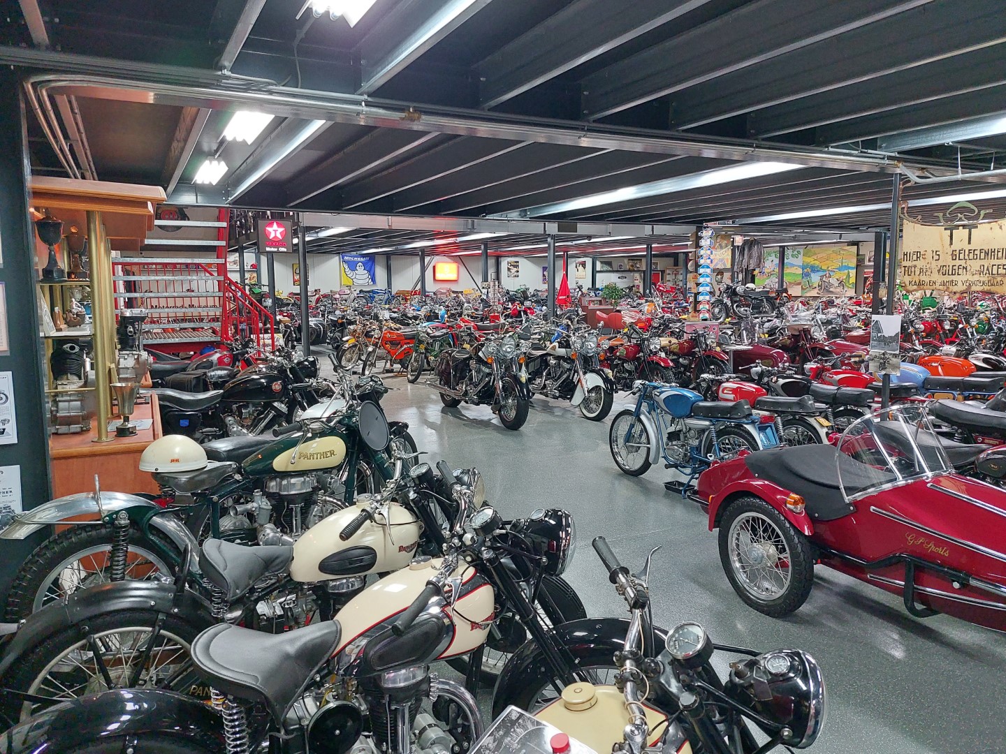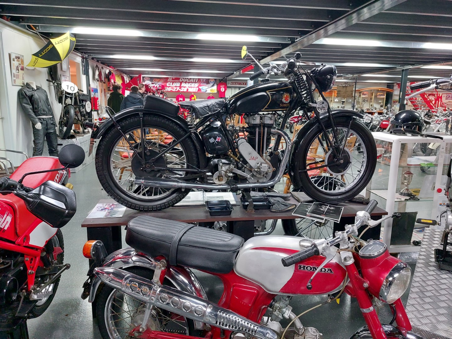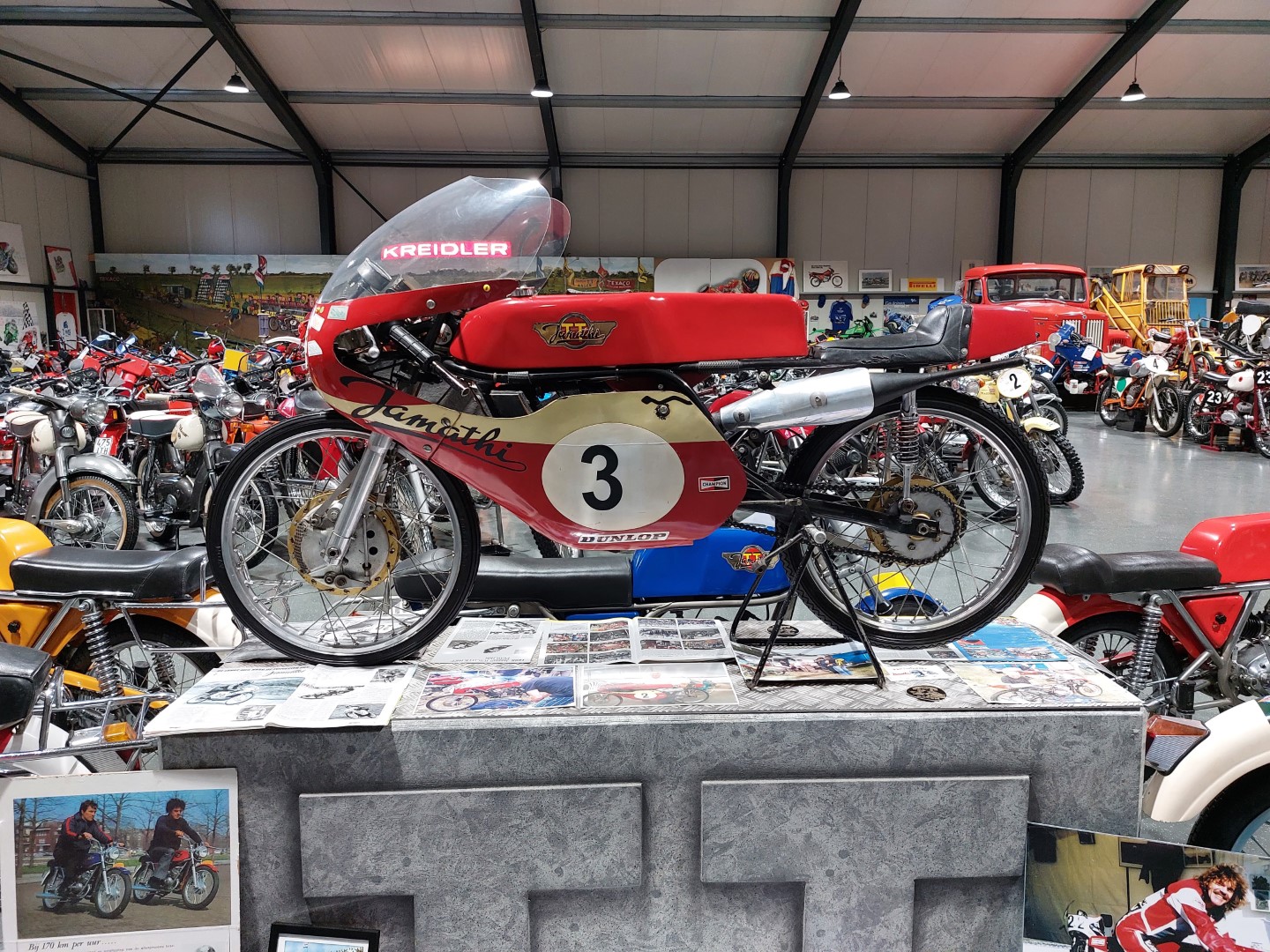 soortgelijke Panther zoals hij die ook gehad heeft. Het accent ligt op de naoorlogse klassiekers, alhoewel er ook bijvoorbeeld een Batavus of een Scott racemotor uit 1936 zijn te bewonderen. Maar de Bayliss Thomass racemotor van zijn vader heeft hij nooit meer kunnen achterhalen. Wel staat er een JAP-motorblok waarmee zijn vader wedstrijden reed.