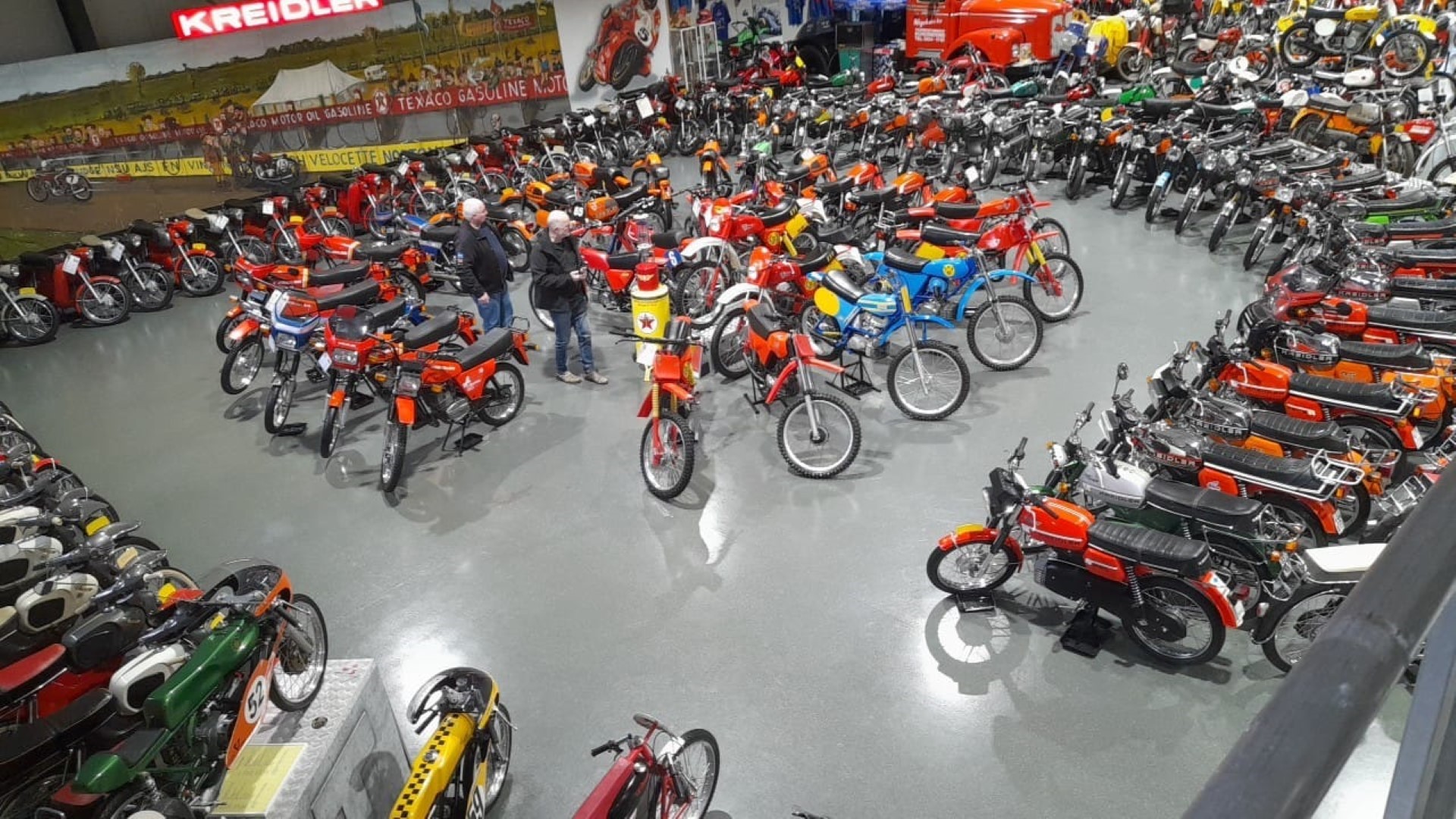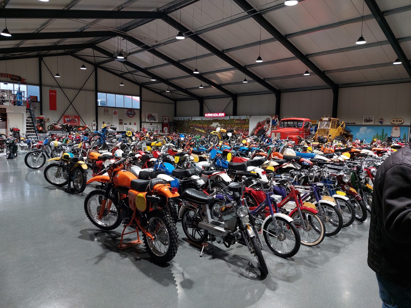 Toen kwamen we aan bij ons eigen merk: Kreidler. Louwrens heeft er een mooi aantal staan, keurig opgesteld in carrévorm. De meeste modellen stonden er en ook machines als